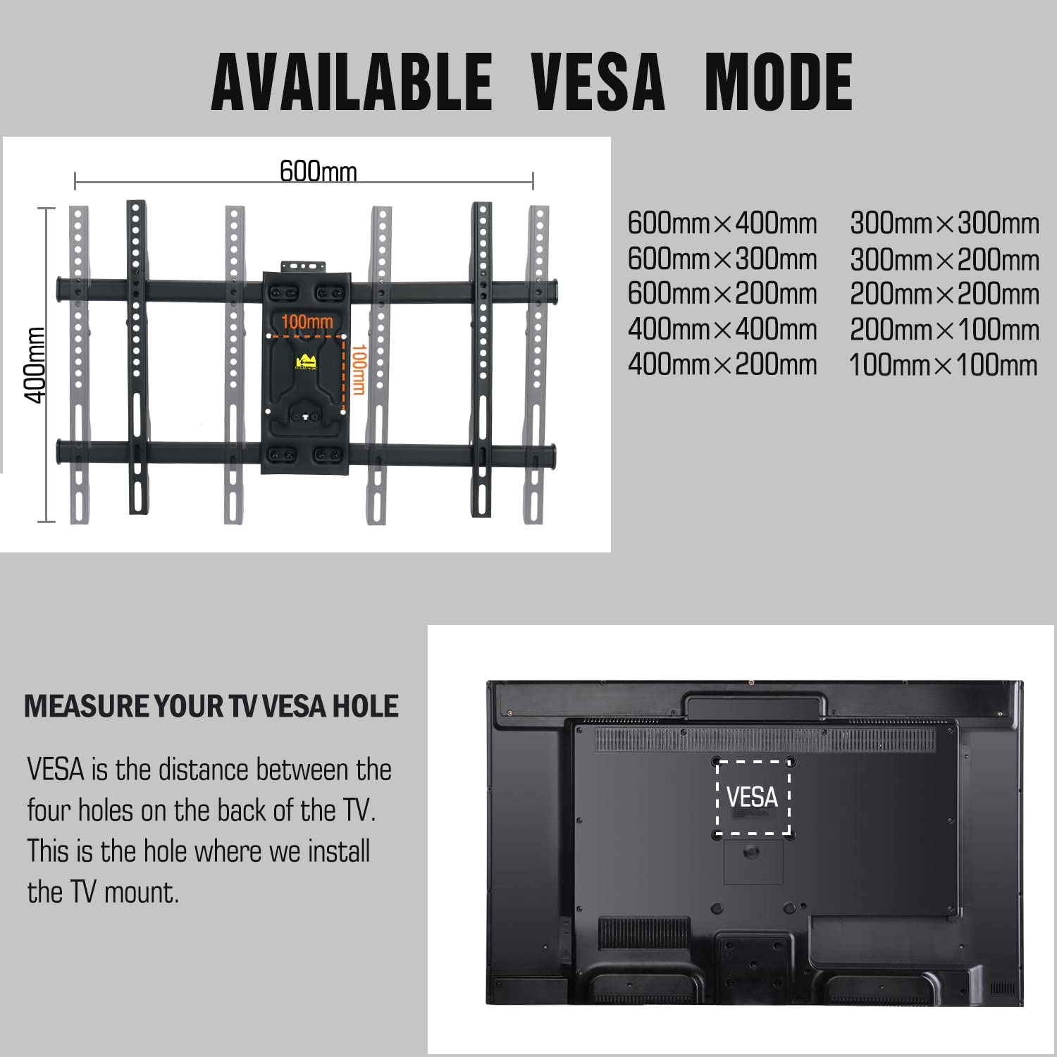 VESA Compatibility: 100x100mm to 600x400mm (not compatible with 100x200mm)