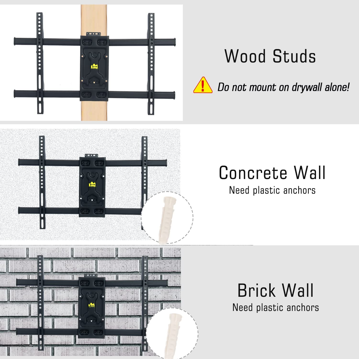 Mounting Types: Solid concrete wall, brick wall, single wood stud wall