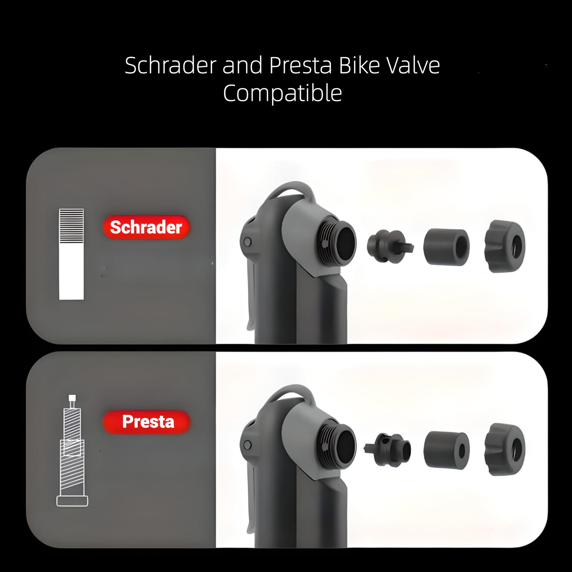 Versatile Compatibility: Works with both Presta and Schrader valves, offering flexibility for different bikes.