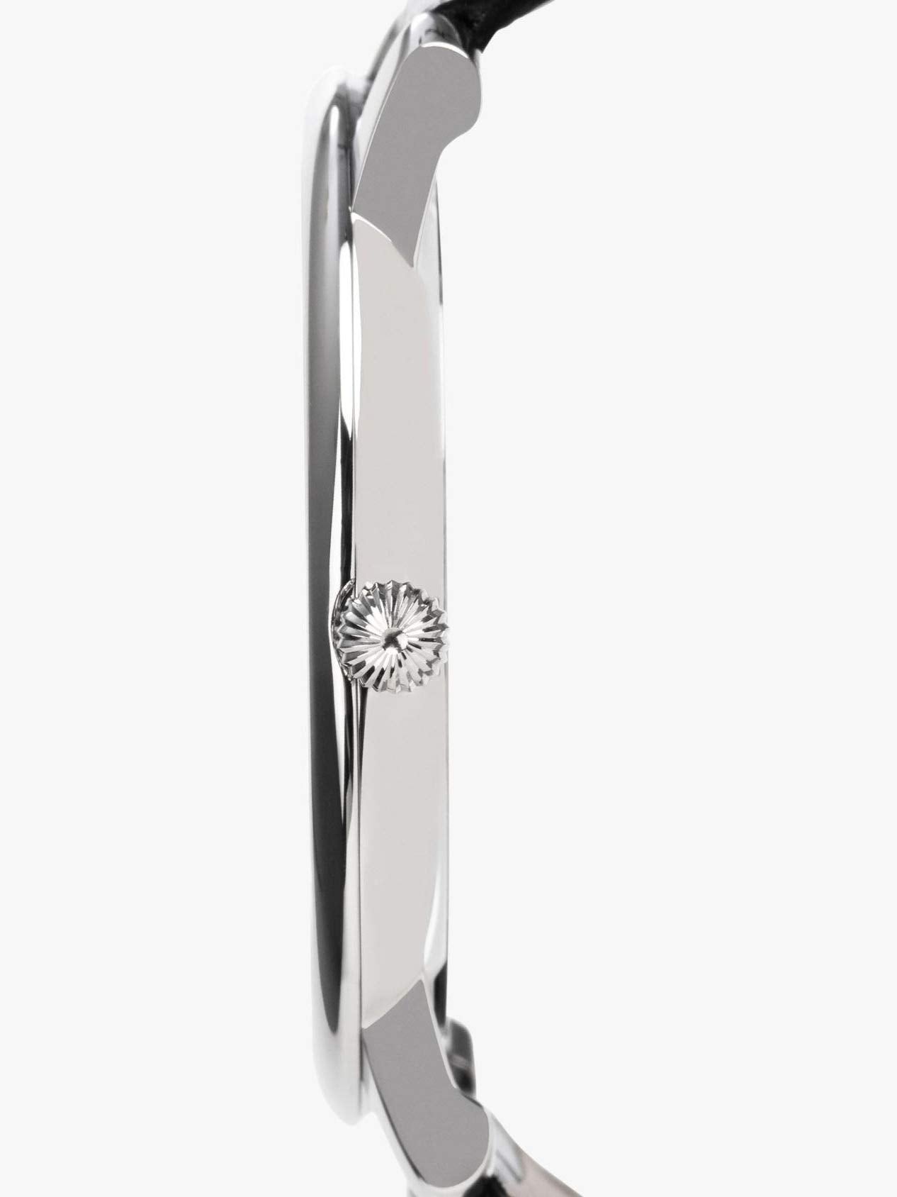 Classic Leather Strap: The black leather strap with a tang buckle offers all-day comfort and traditional style that suits any wardrobe.