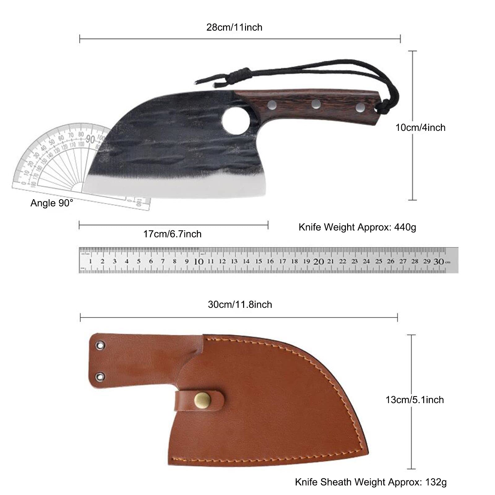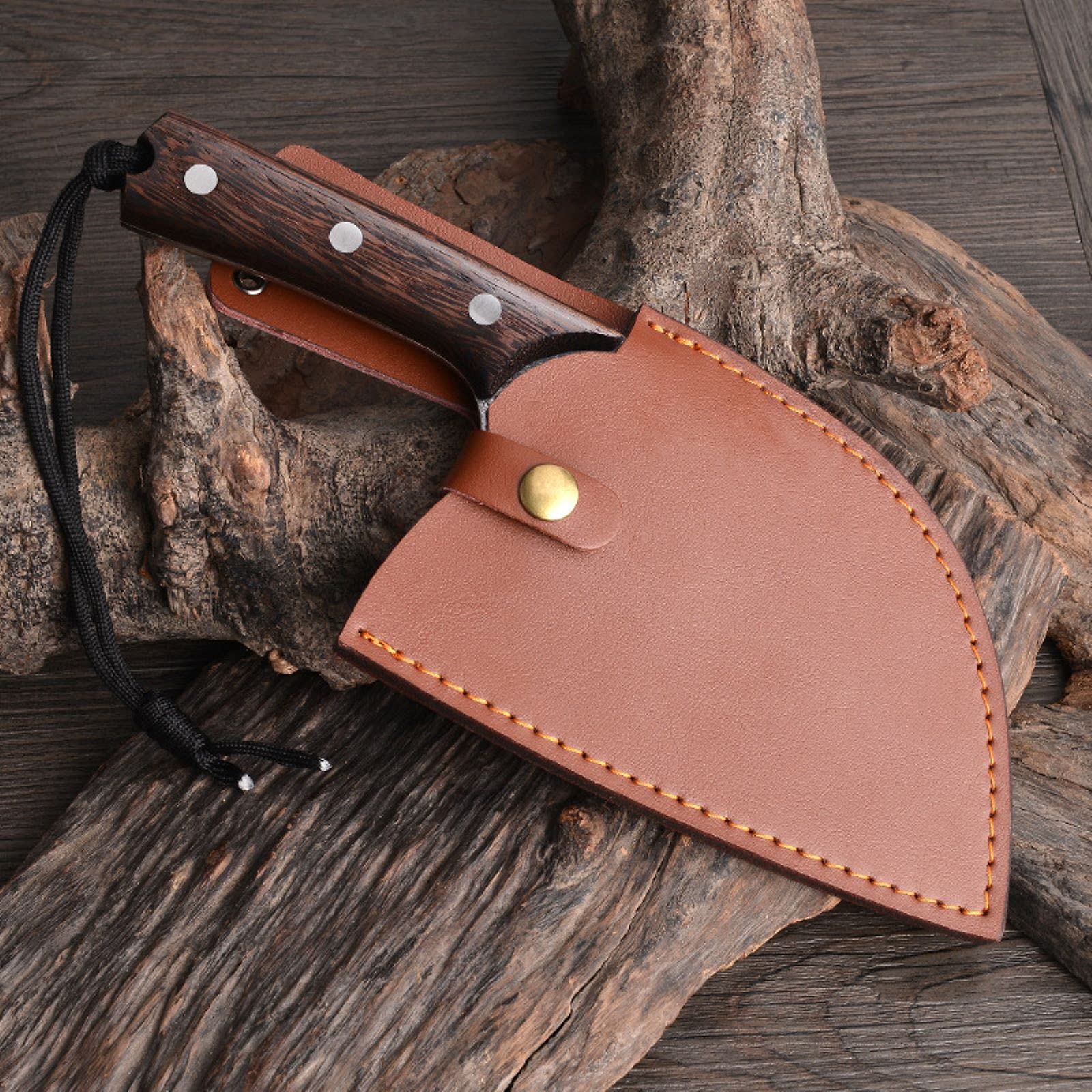 Portable Leather Sheath: Equipped with a protective leather sheath, this knife is easy to store and carry, making it perfect for camping, picnics, or BBQs.
