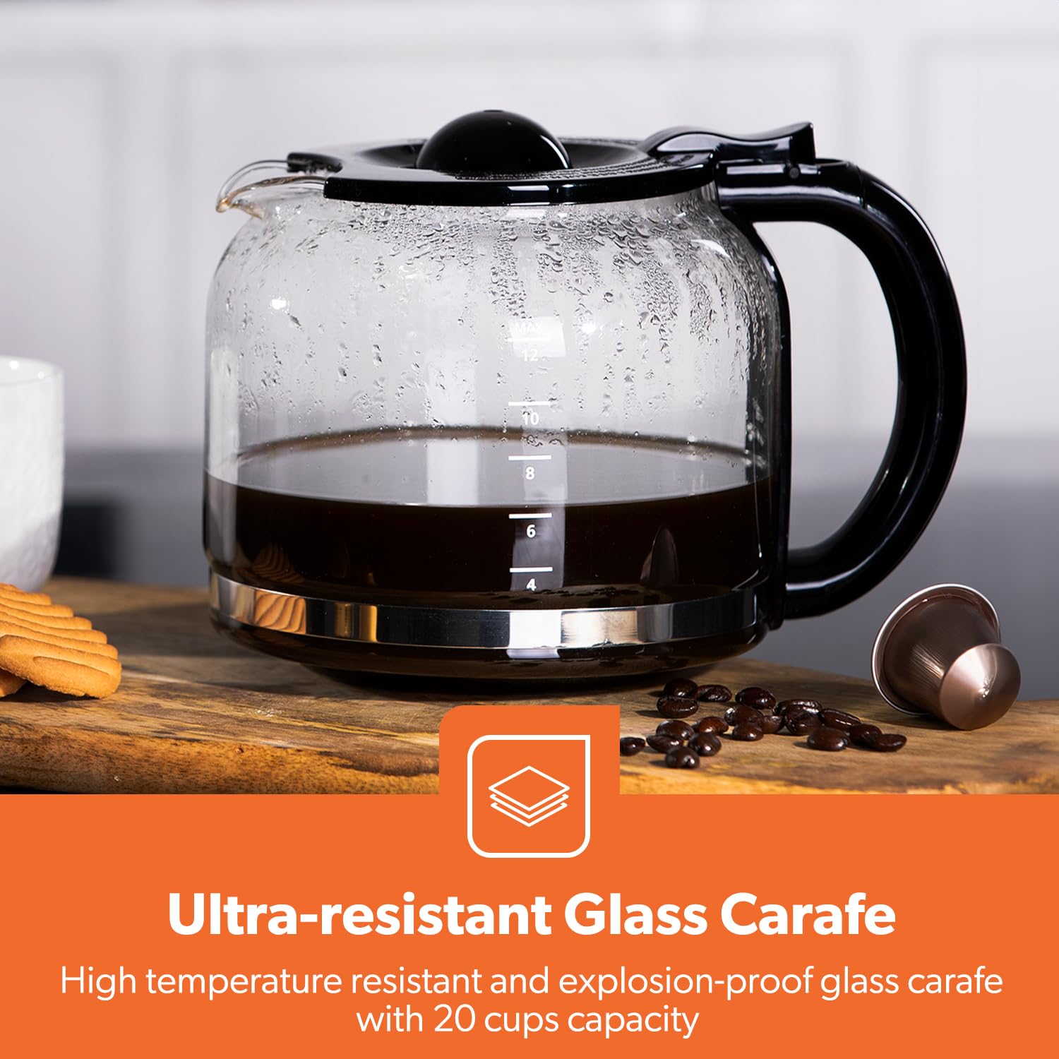 1.5L Durable Glass Carafe: Brew up to 12 cups of coffee with the high-quality glass carafe, designed to keep your coffee warm for longer with a non-slip handle for easy pouring.
