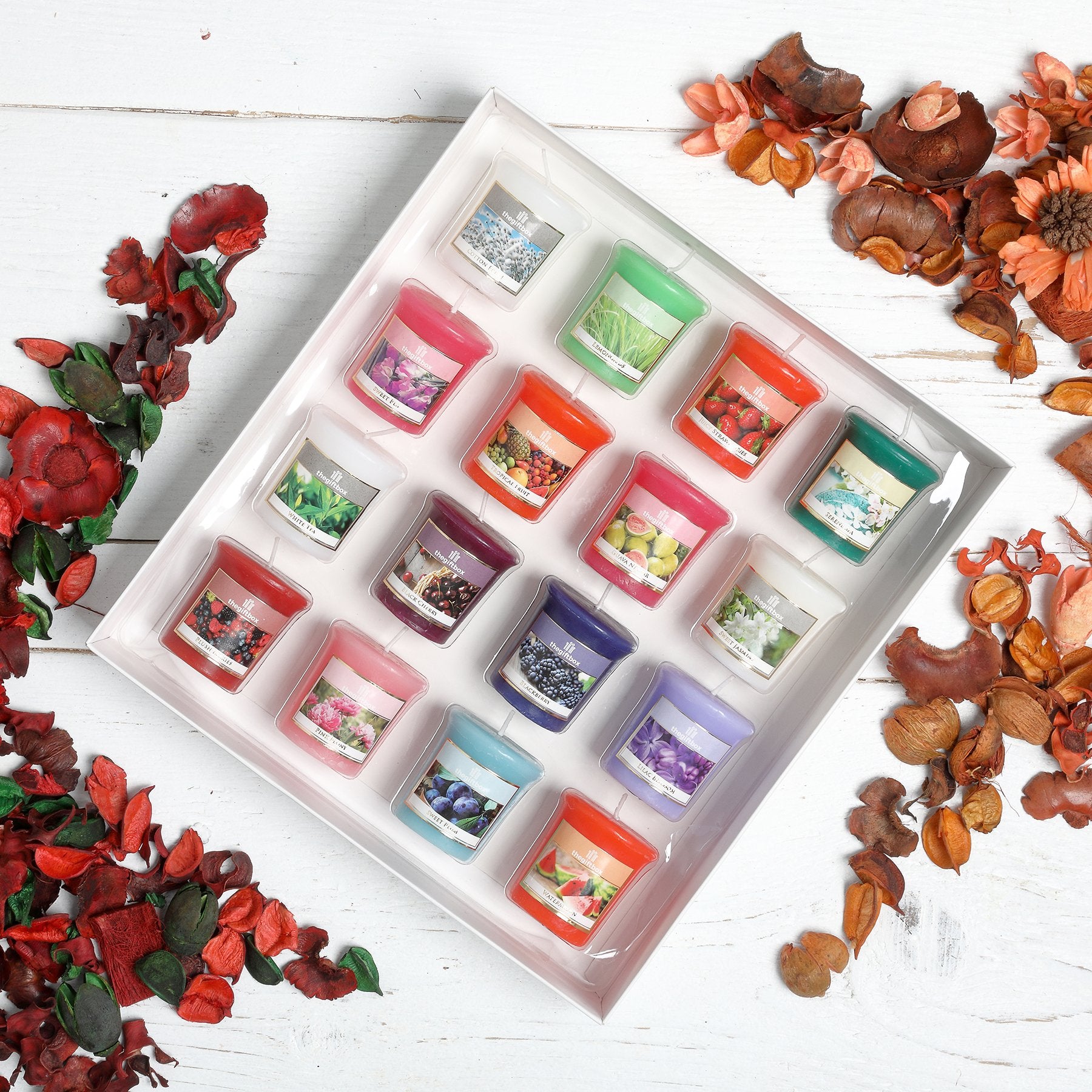 16 Distinct Candle Scents: From Serene Spa to Sweet Plum, each votive brings a new mood—fresh, floral, fruity, and calming