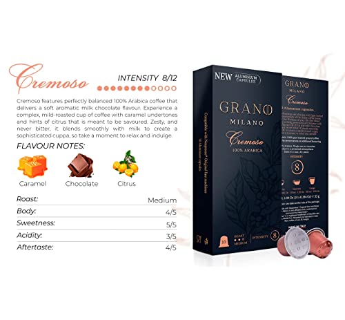 - Grano Milano Cremoso | 50 Aluminium Coffee Pods | Compatible with Nespresso Original line, 100% Arabica Medium Roast | Intensity 8/12 | Coffee Capsules Made in Italy | Espresso Coffee -