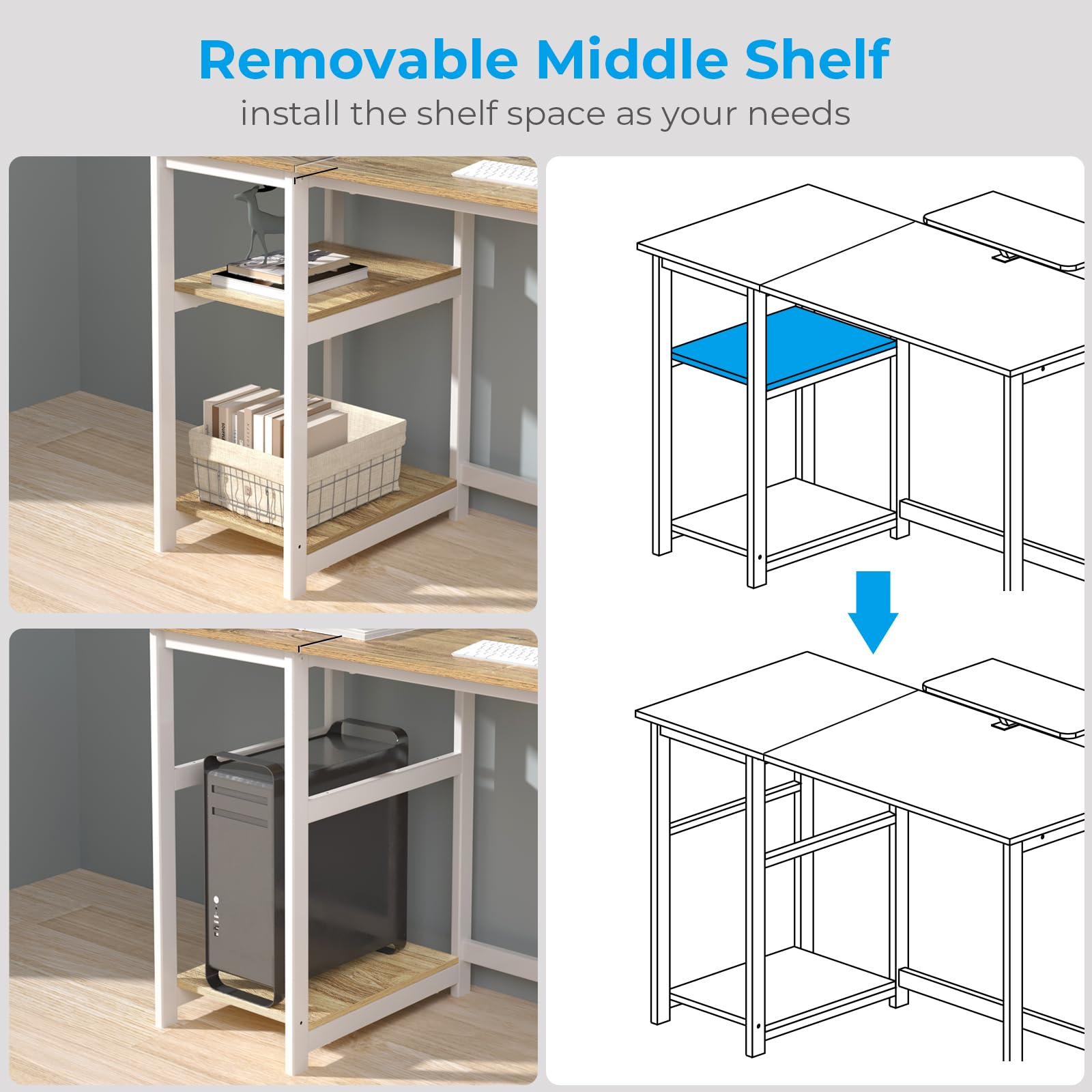 Reversible Storage Shelves: Mount the shelves on either side to suit your space or workflow—perfect for books, CPUs, or even speakers. Remove the middle shelf to open up more room if needed.