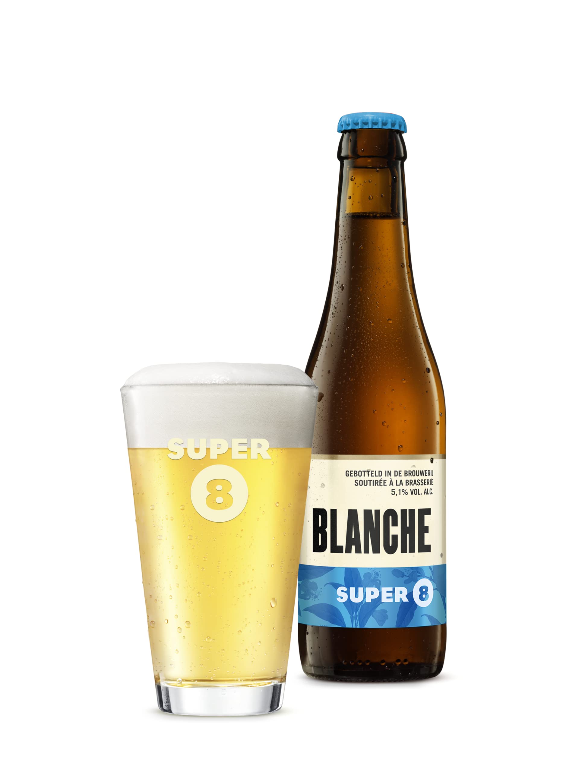 SUPER 8 Blanche 5.1% ABV: A refreshing white beer with coriander and orange zest, offering a piquant twist on a classic style.