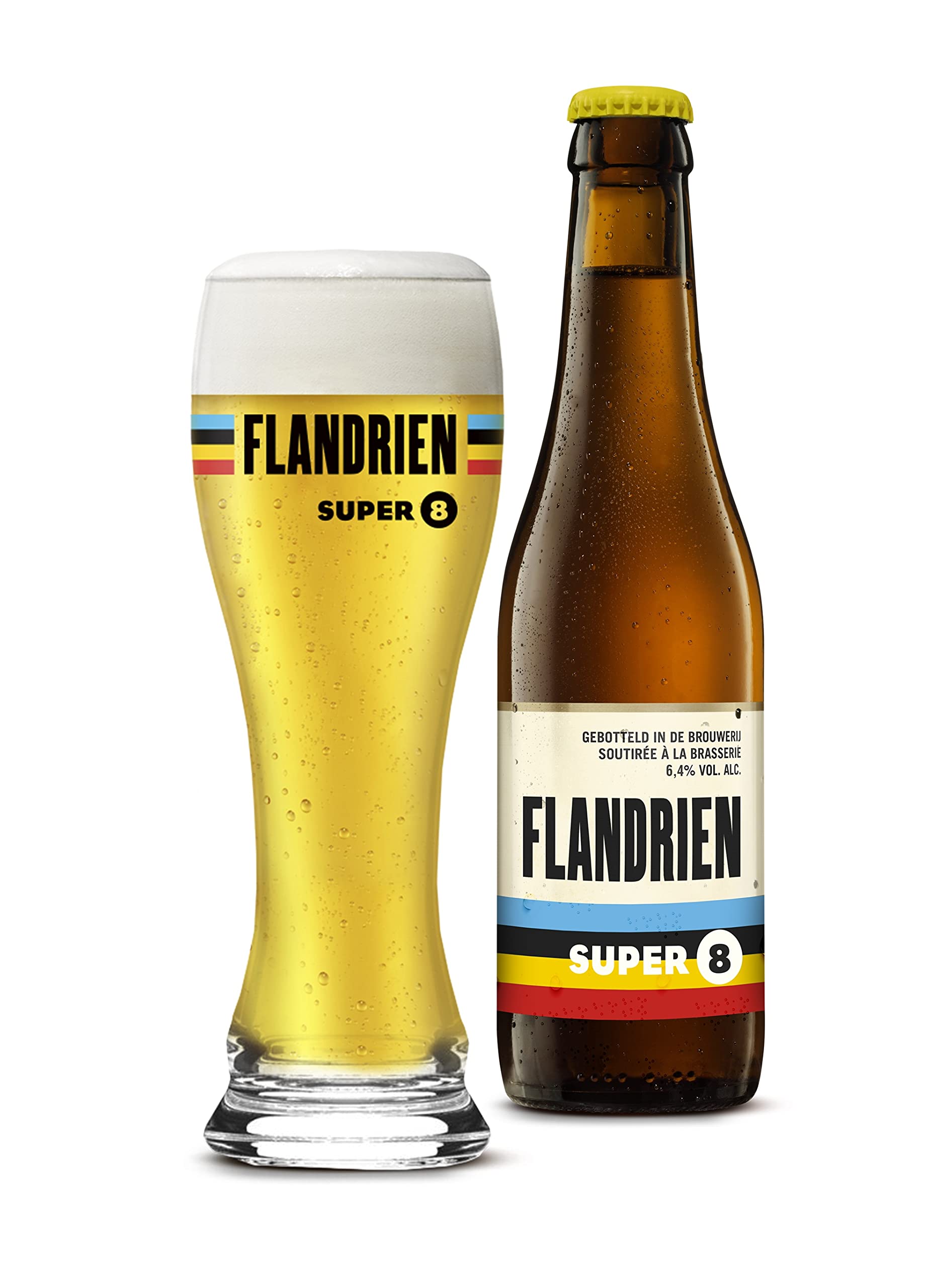 SUPER 8 Flandrien 6.4% ABV: A characterful blond beer flavored with hop, coriander, oak, and vanilla, offering a strong yet drinkable taste.