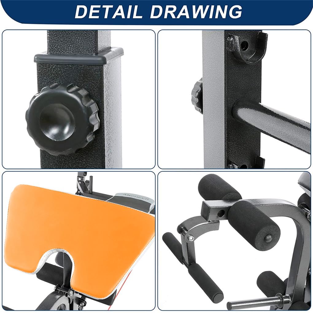 Multifunctional Full-Body Workouts: Equipped with a squat rack, leg extension, preacher curl, and a weight bench set, this bench is designed for versatile exercises that target multiple muscle groups.