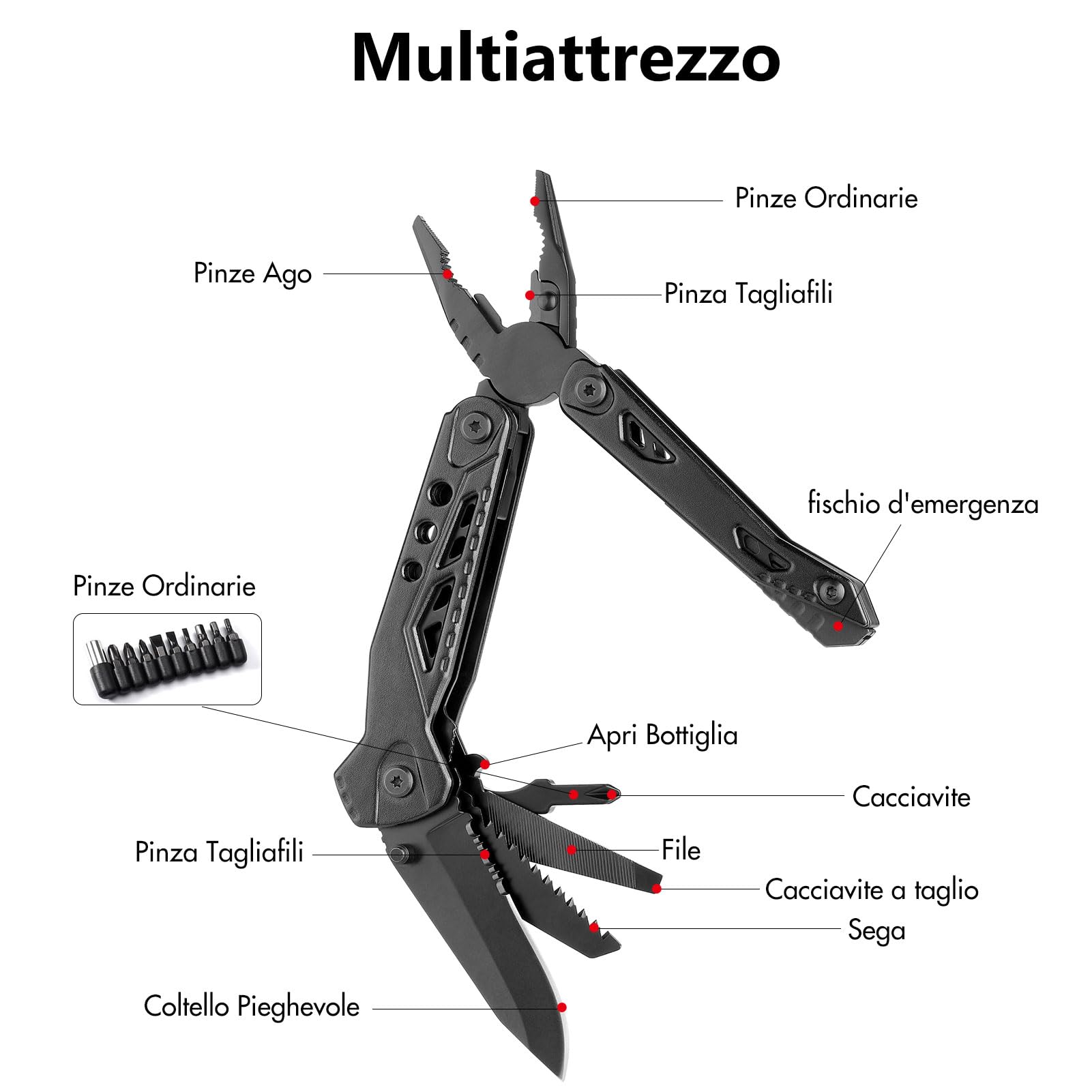 Included Tools: Needle-nose pliers, standard pliers, wire cutters, rope cutter, file, saw, screwdriver, knife, and more