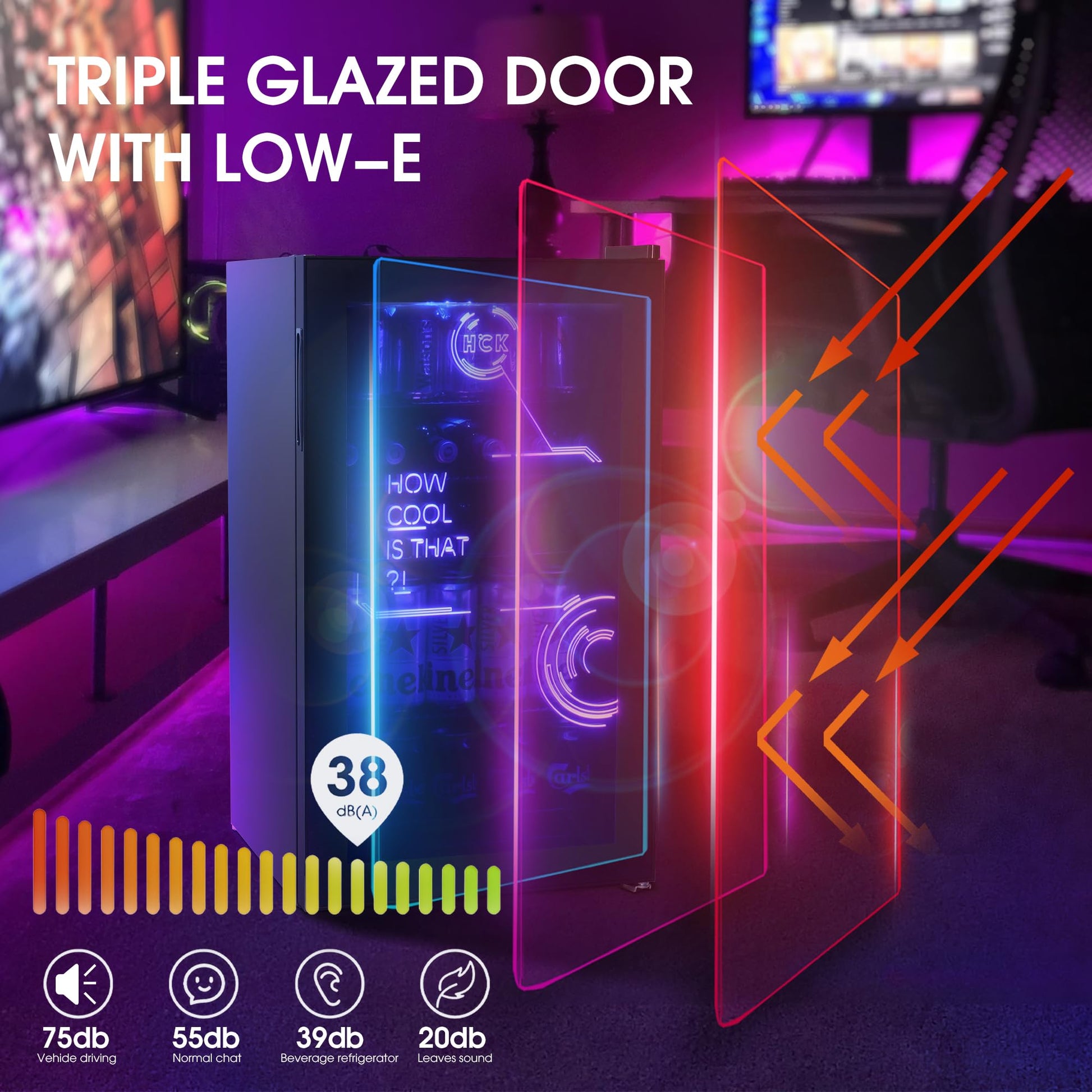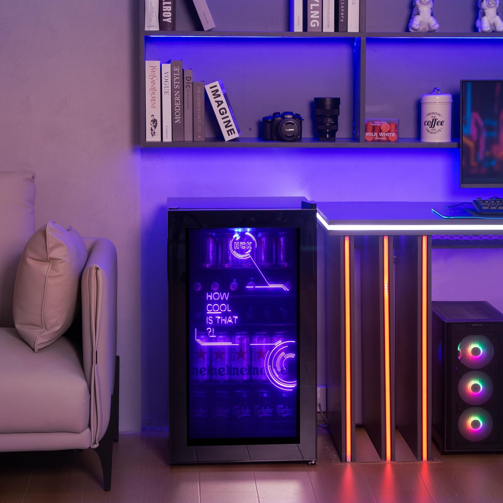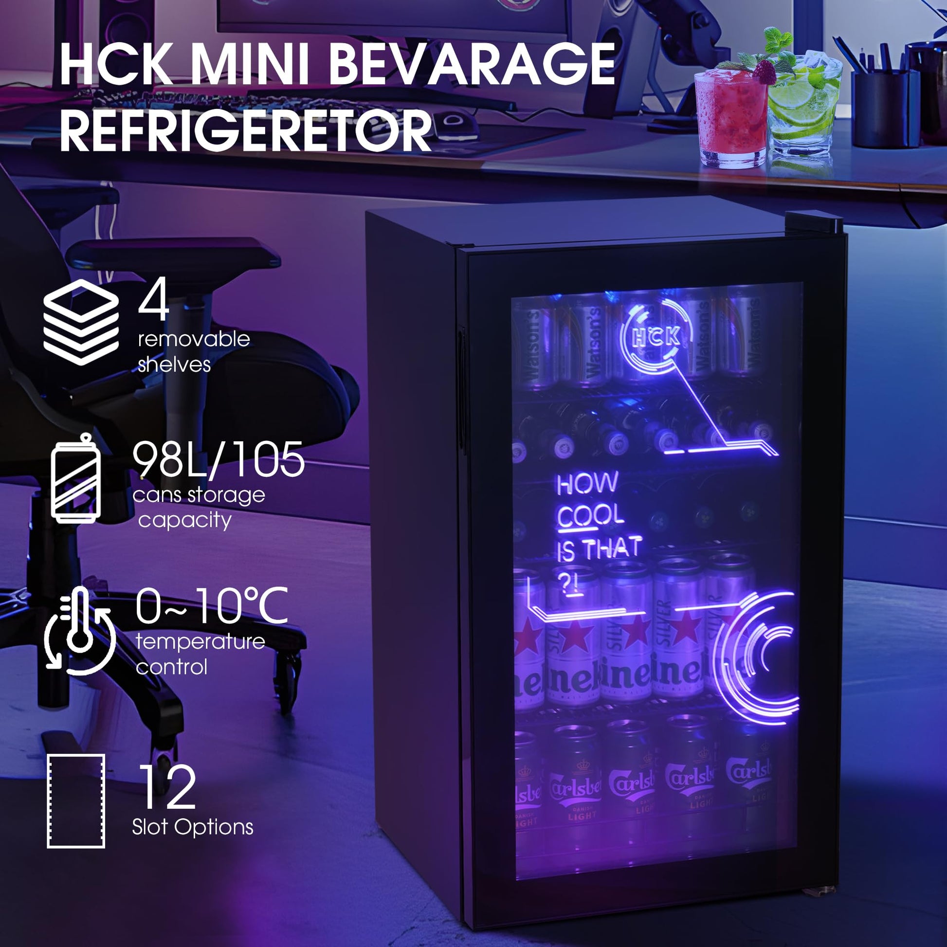 - HCK 98L Cyberpunk Mini Beer Fridge with Glass Door | Beverage Refrigerators | 0-10°C | Led Light -