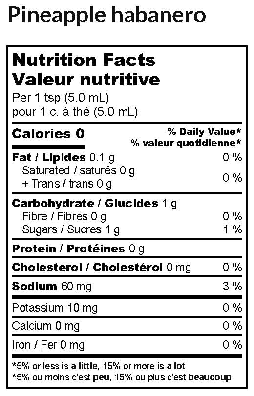 Ingredients: Pineapple, Yellow Bell Pepper, Onion, Distilled Vinegar, Habaneros, Organic Cane Sugar, Lime Juice, Kosher Salt, Garlic, Canola Oil, Ale (Water, Hops, Malted Barley, Yeast)