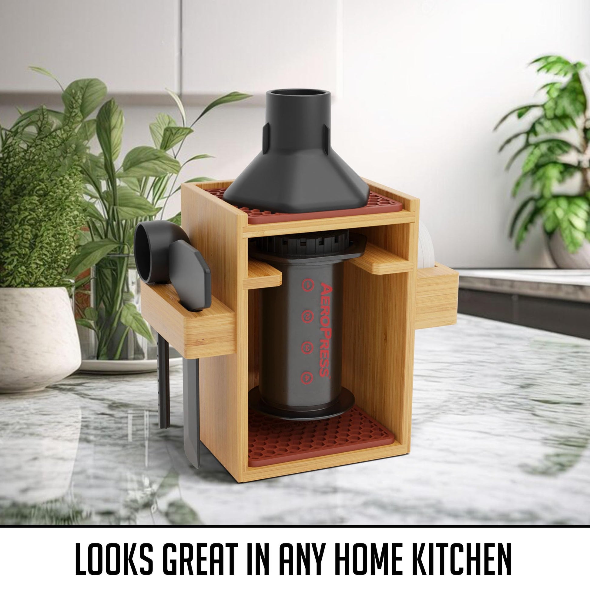 Countertop Style – Made from rich, warm bamboo with two easy-to-clean silicone mats, this organizer doubles as a drying station for your AeroPress press and accessories, blending style with functionality.