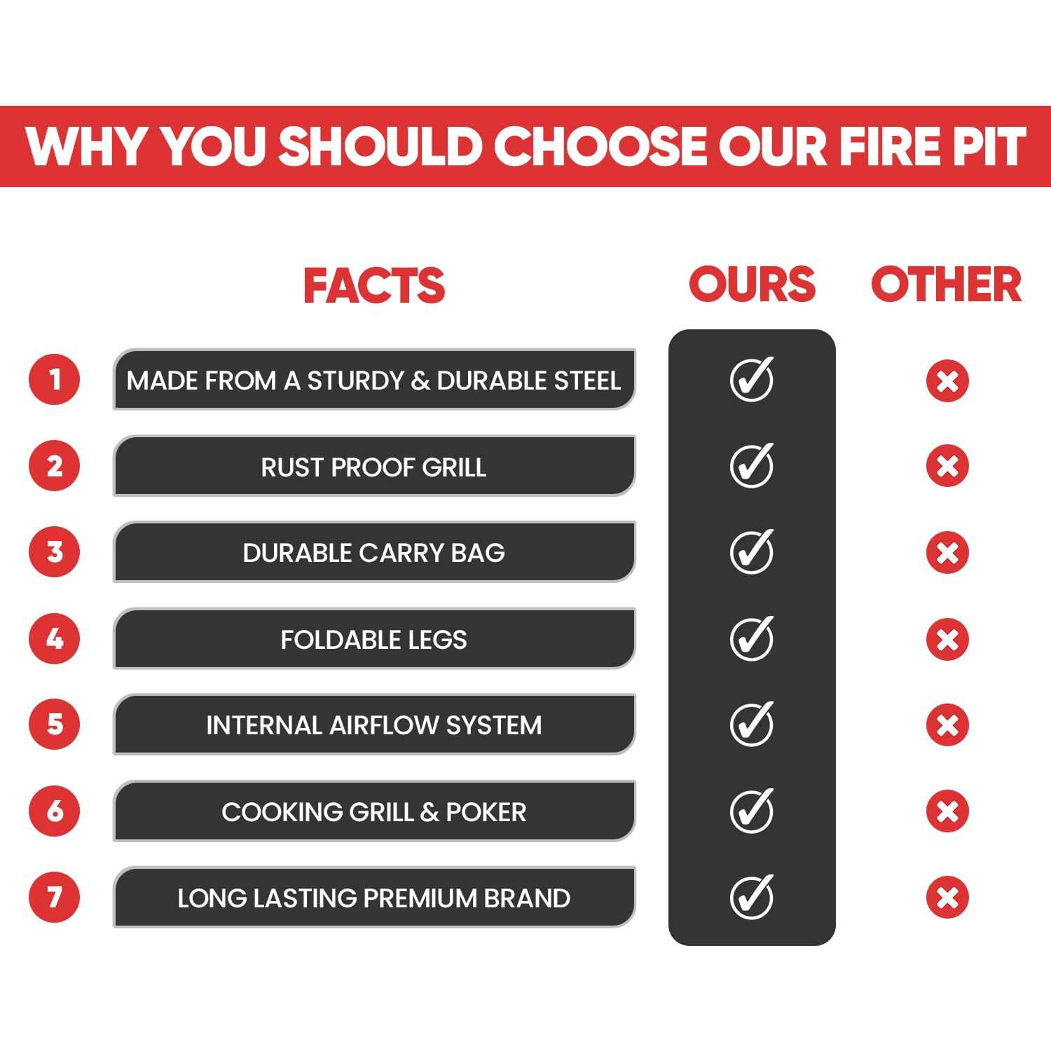 Package Includes: Fire bowl, mesh cover, charcoal grate, cooking grill, poker, foldable legs, carry bag