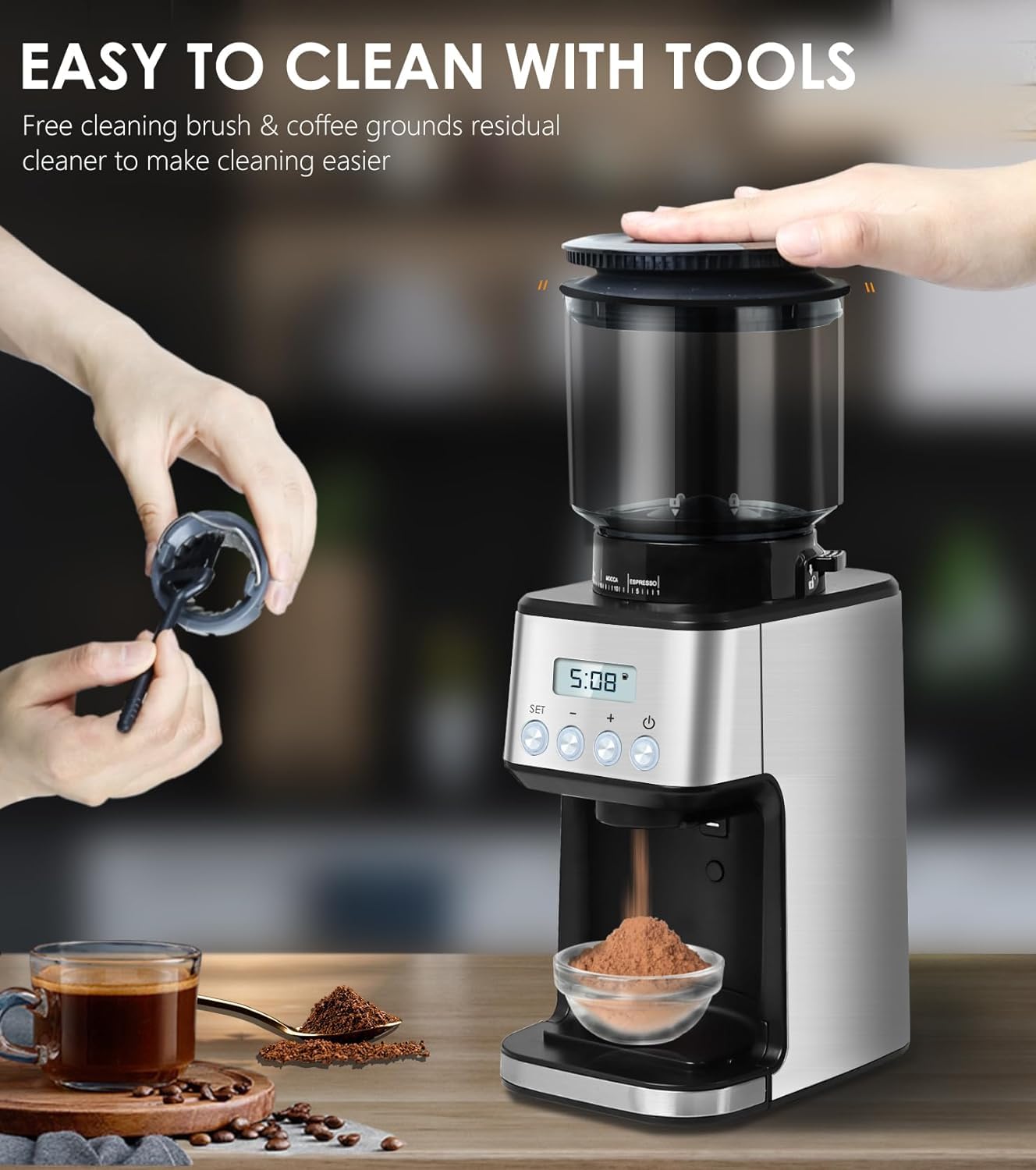Stainless Steel Burr Grinder: 40mm stainless steel burrs provide consistent, uniform grinding with minimal heat, preserving the flavor of your coffee.