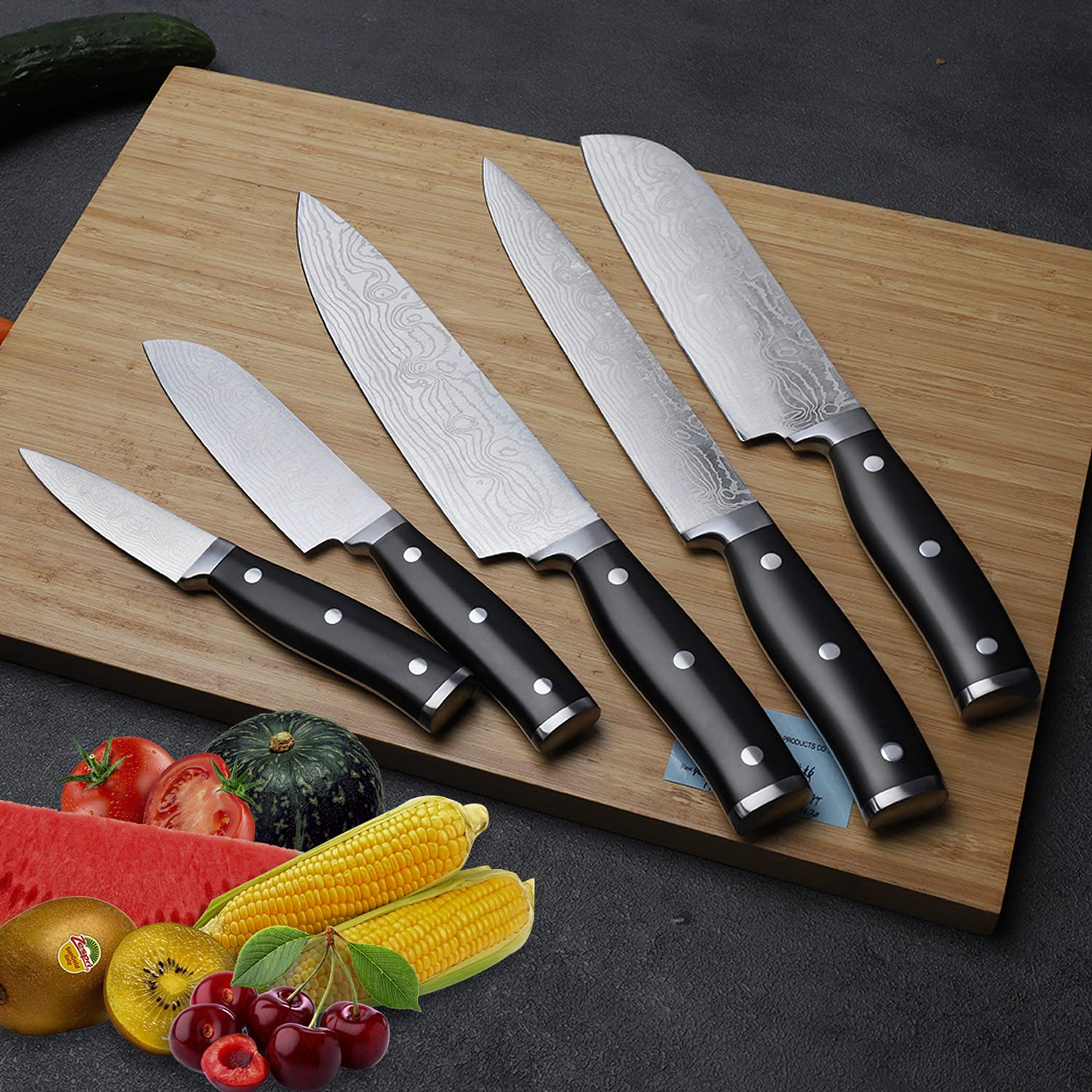 5-Piece Knife Set – Includes Chef Knife, Slicer Knife, Santoku Knife, Utility Knife, and Paring Knife, covering all essential kitchen tasks.