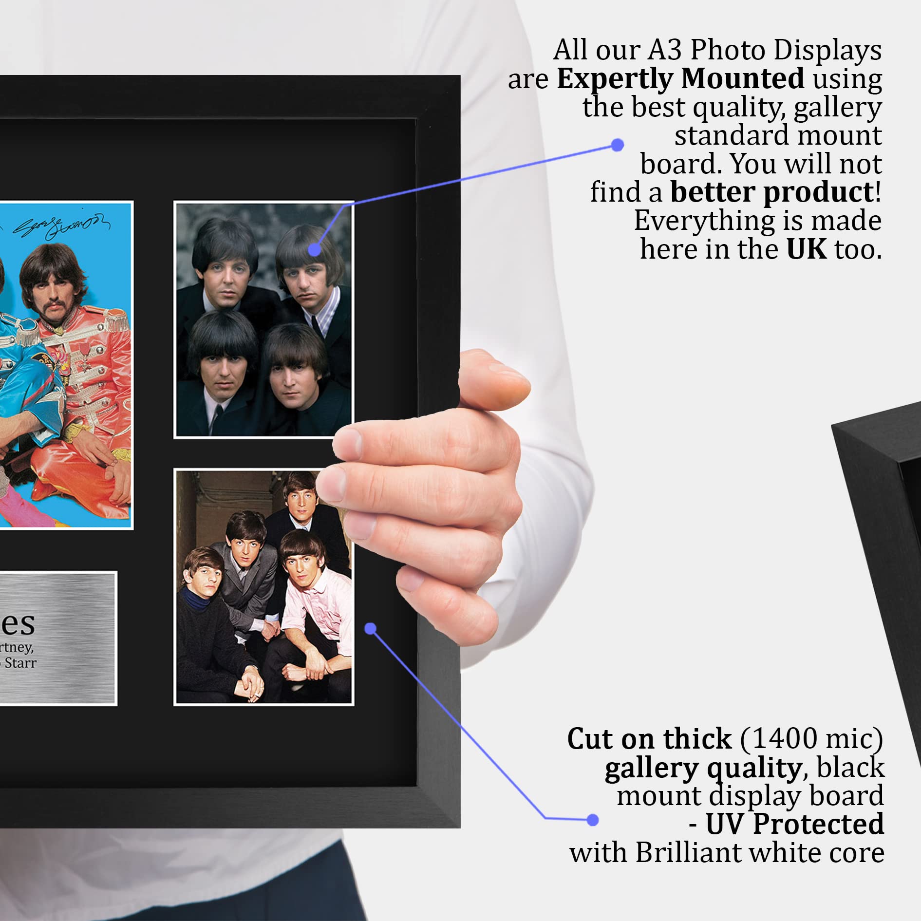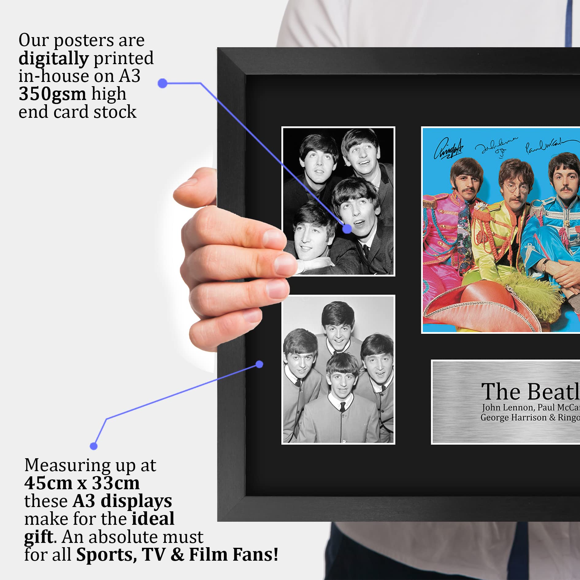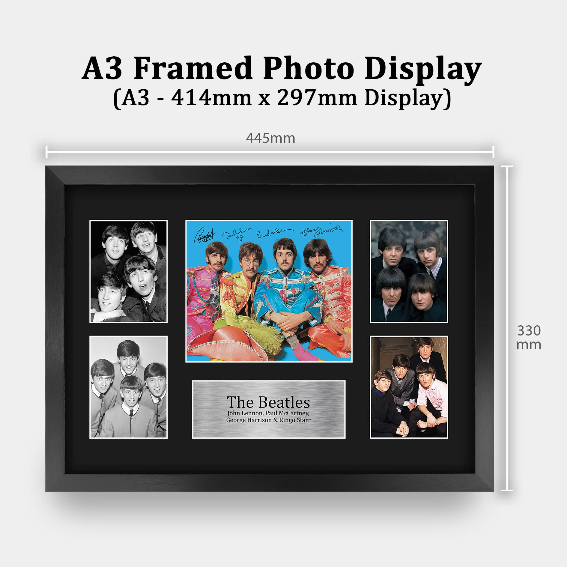 Legendary Music Memorabilia: This A3 (330x445mm) display features a signed photo of The Beatles, capturing the essence of one of the most influential bands in history.