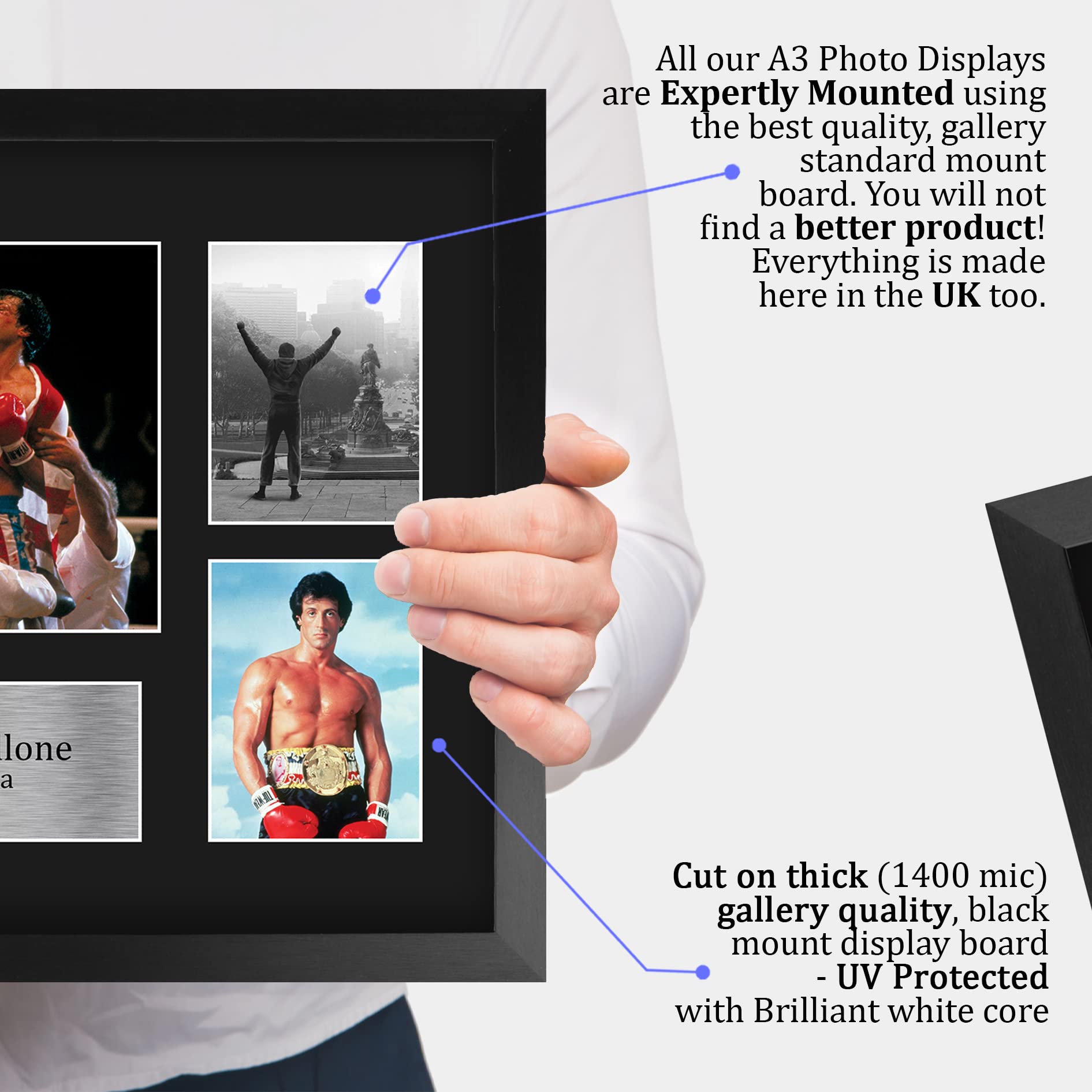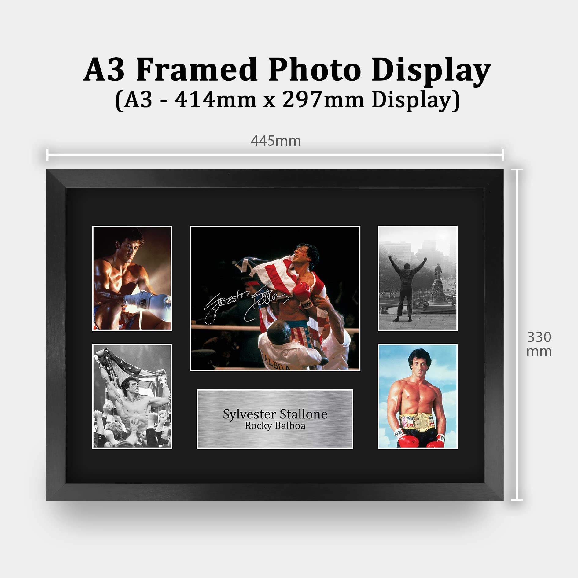 Iconic Movie Memorabilia: This A3 (330x445mm) display showcases classic images from Rocky, with a printed autograph from Sylvester Stallone, capturing the spirit of the legendary fighter.