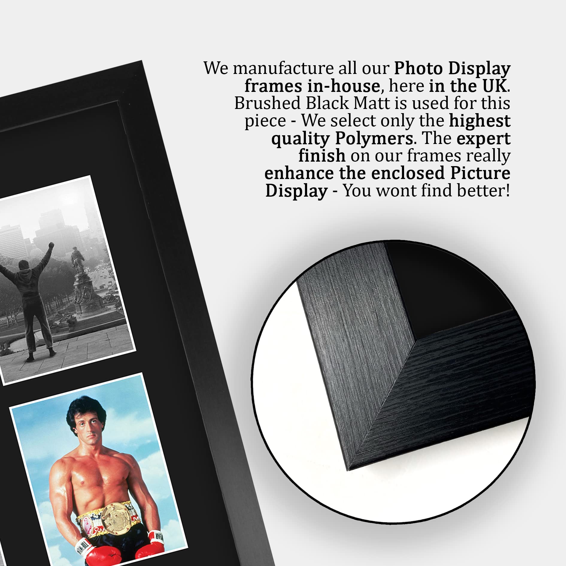 Detailed Design: The framed display features a series of four classic images with a central focal point and a metallic effect plaque detailing Stallone's career achievements.