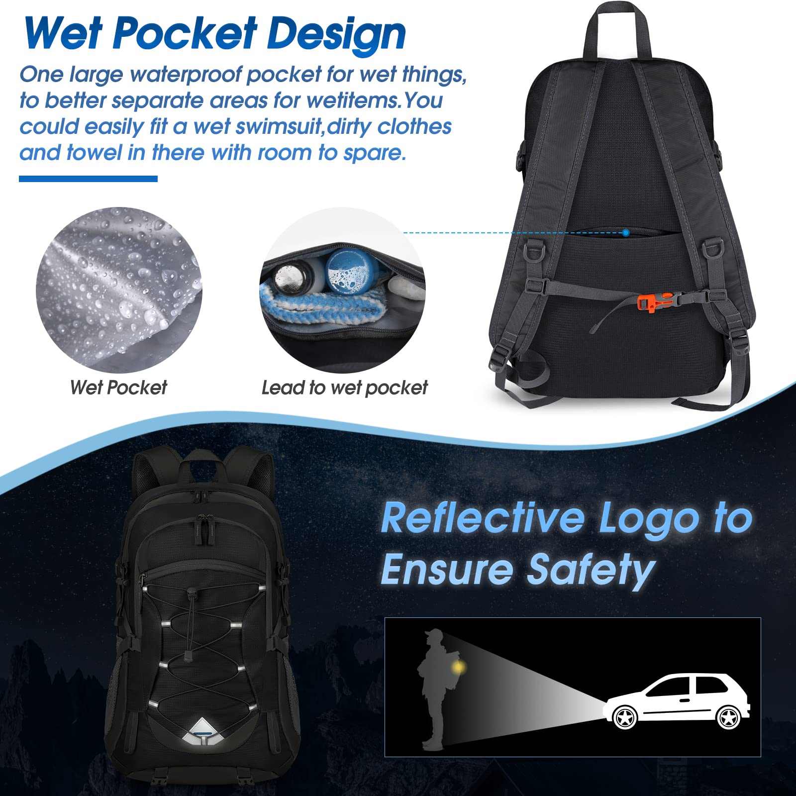 Large Capacity & Multi-Compartment: Features a 40L storage capacity, with one main zipper compartment, two zipper front pockets, two side pockets, and a waterproof wet pocket for separating items. Additional pen pockets and slip pockets help keep your items organized.