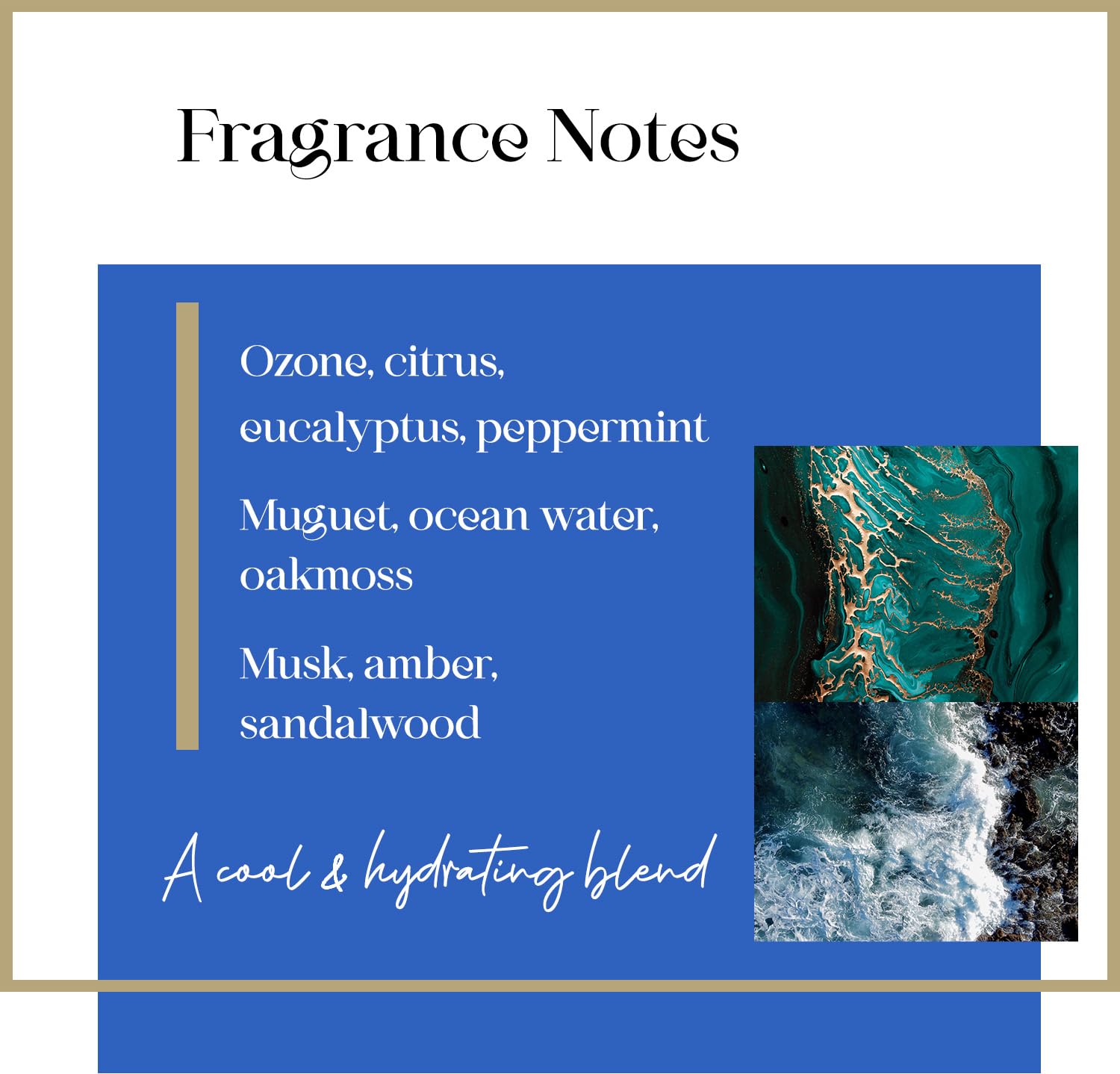 Hydrating Fragrance – Infused with a luxurious blend of sea minerals and oakmoss, delivering a fresh, invigorating scent