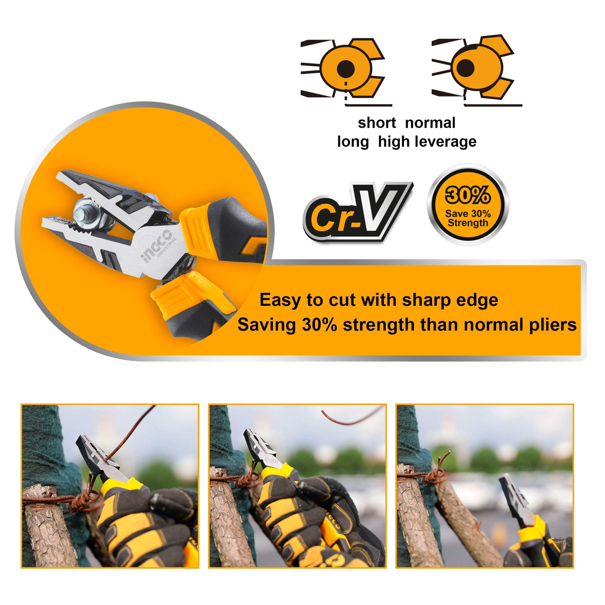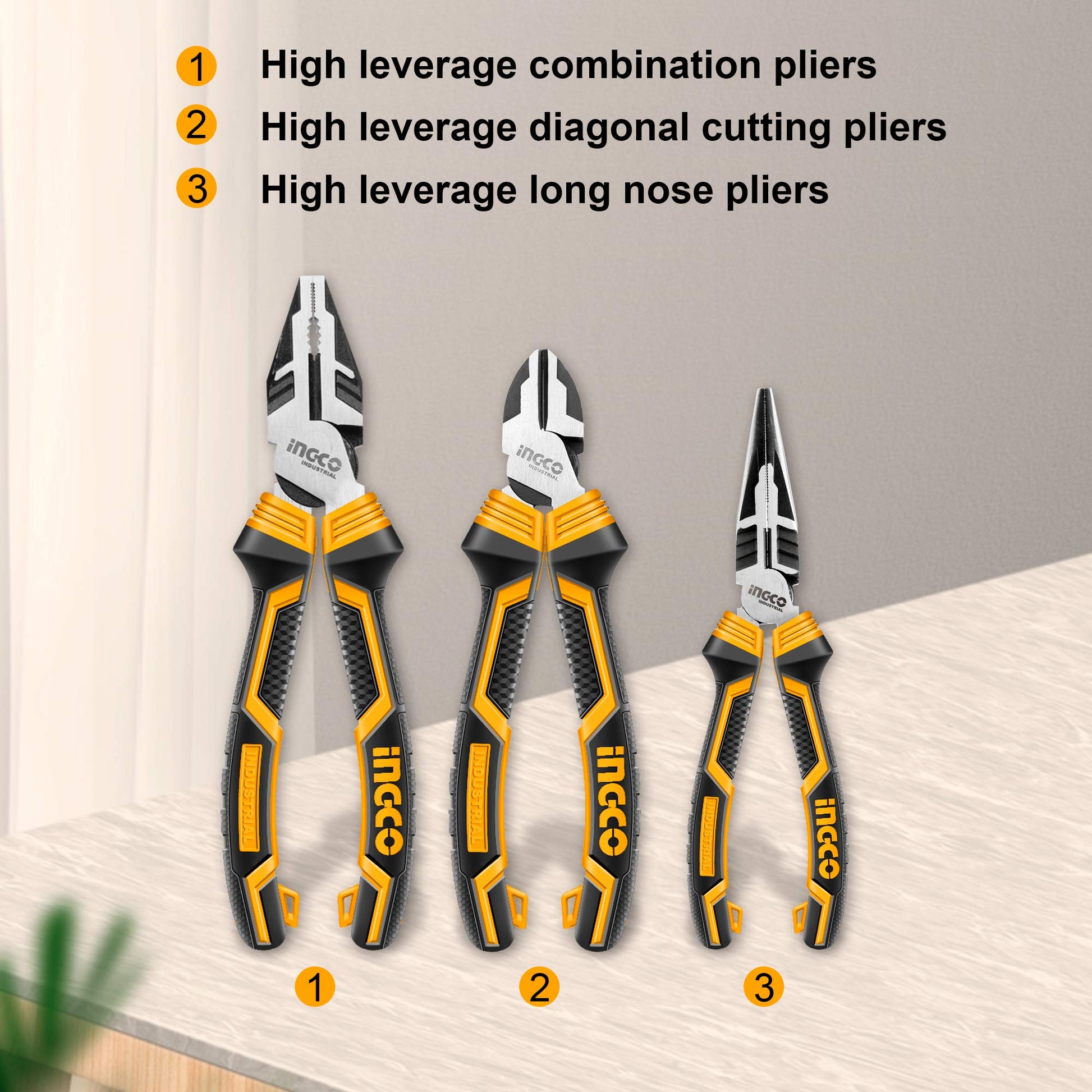 - INGCO 3Pcs High Leverage Pliers Set | 8" Combination Pliers | 7" Diagonal Cutting Pliers | 6" Long Nose Pliers -