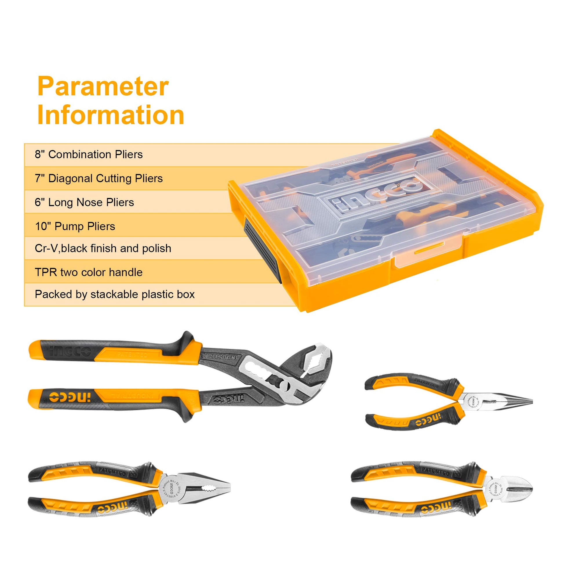 - INGCO 4Pcs Pliers Set 8 Inch Combination Pliers | 7 Inch Diagonal Cutting Pliers | 6 Inch Long Nose Pliers | 10 Inch Pump Pliers -