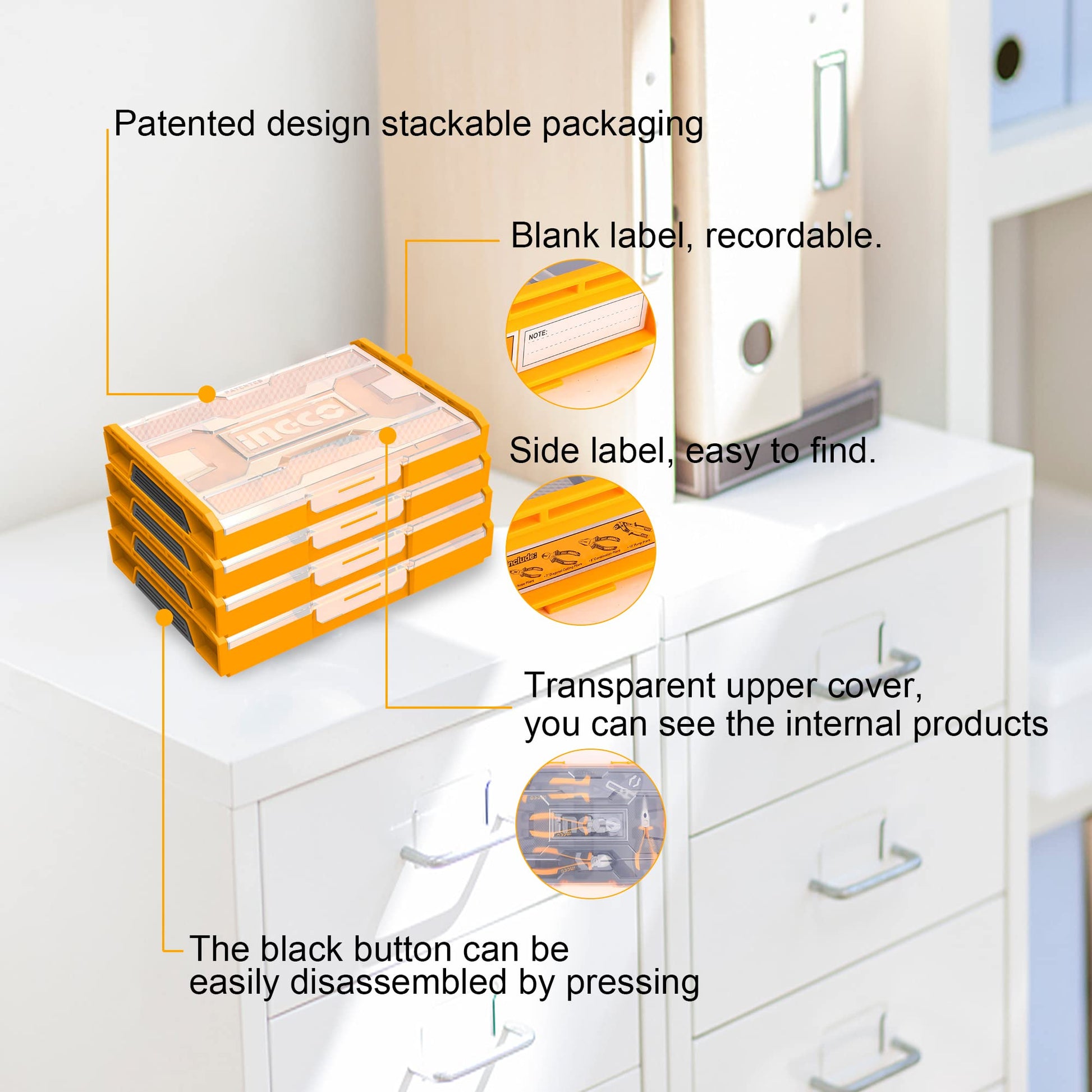 Patented Packaging Design: The stackable plastic box keeps the tools organized and easily accessible. The transparent cover and side labels make it quick to find the tool you need.