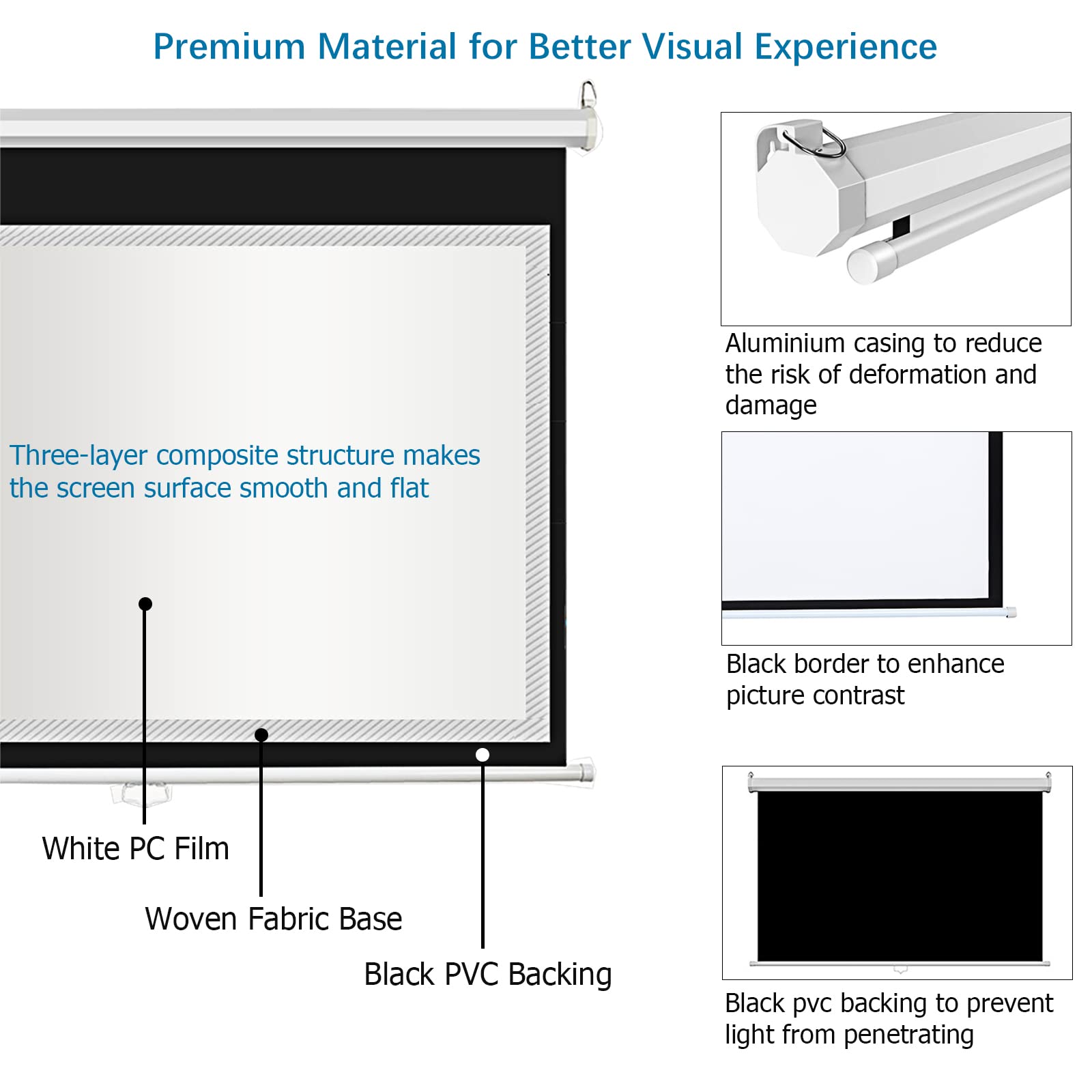 Premium Material Construction: Made of composite fabric with a matte finish, this screen ensures smooth, flat surfaces for optimal image quality and minimizes ambient light interference.