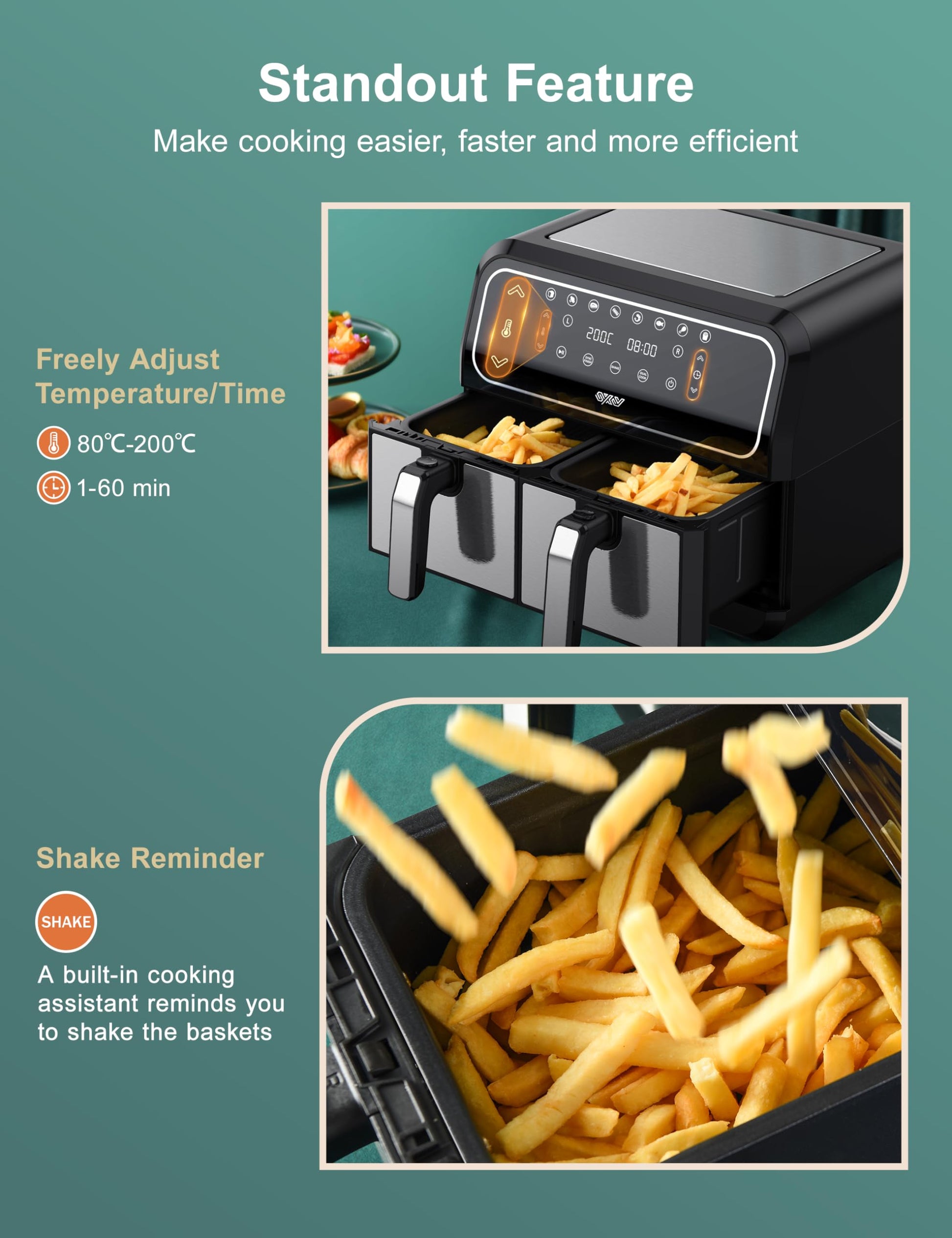Shake Reminder: A built-in shake reminder lets you know when it's time to shake each basket for even cooking. This ensures a perfect crispness every time.