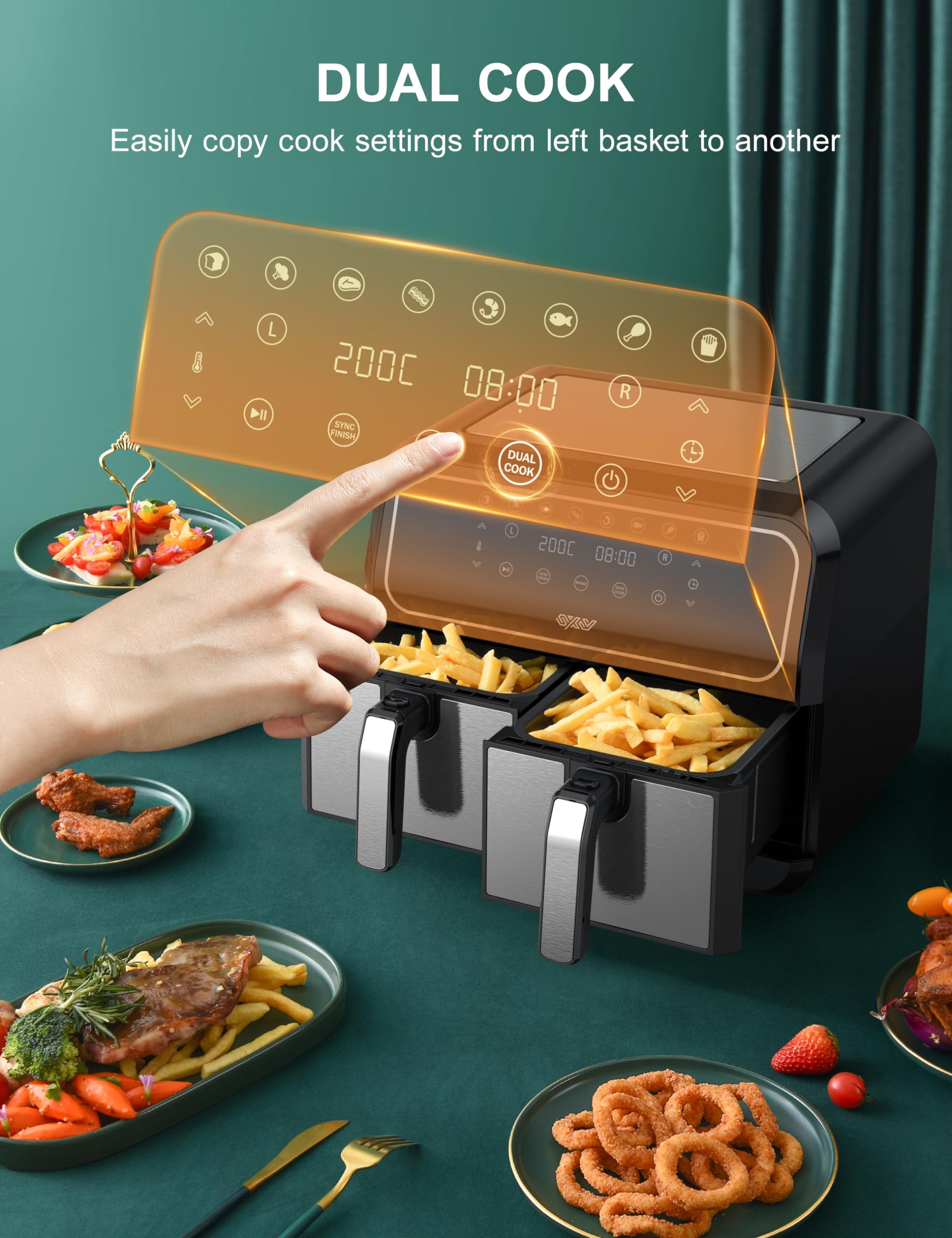 Dual-Cook Mode: Automatically synchronizes settings between the two baskets for a seamless, efficient cooking experience when preparing different dishes at full capacity.