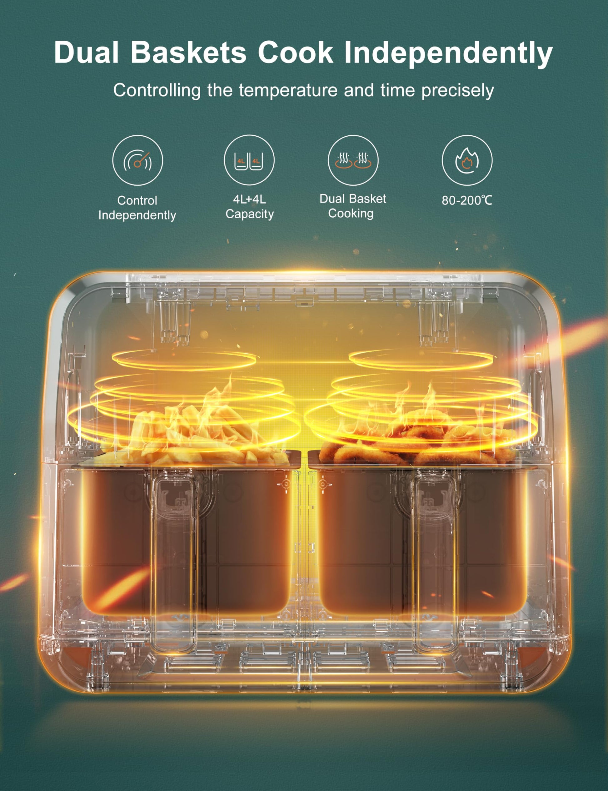 Dual 4L Baskets: Perfect for families and gatherings, with two 4L baskets that allow you to cook up to 8L of food at once. Ideal for 2 to 8 people, it accommodates large meals or two different foods prepared simultaneously.