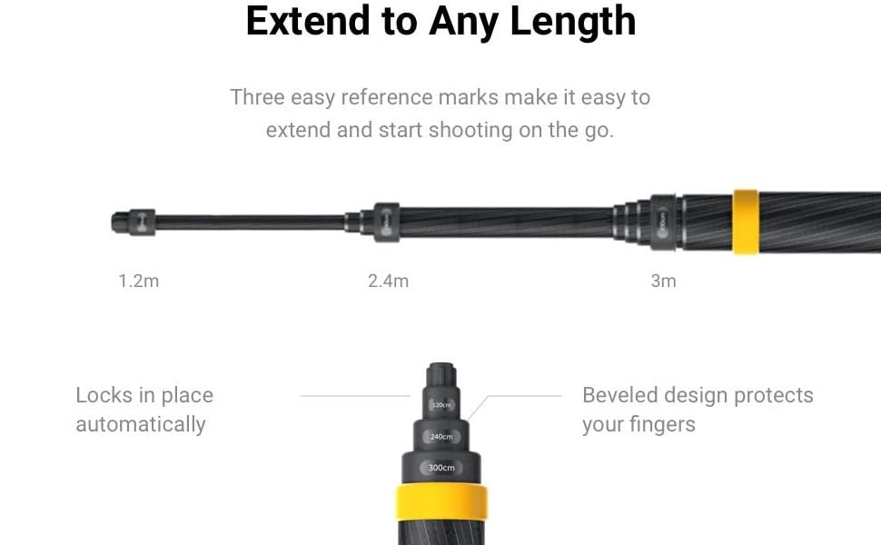 Extended Carbon Fiber Selfie Stick: The 3-meter selfie stick creates drone-like shots for cinematic angles while keeping the camera safe.