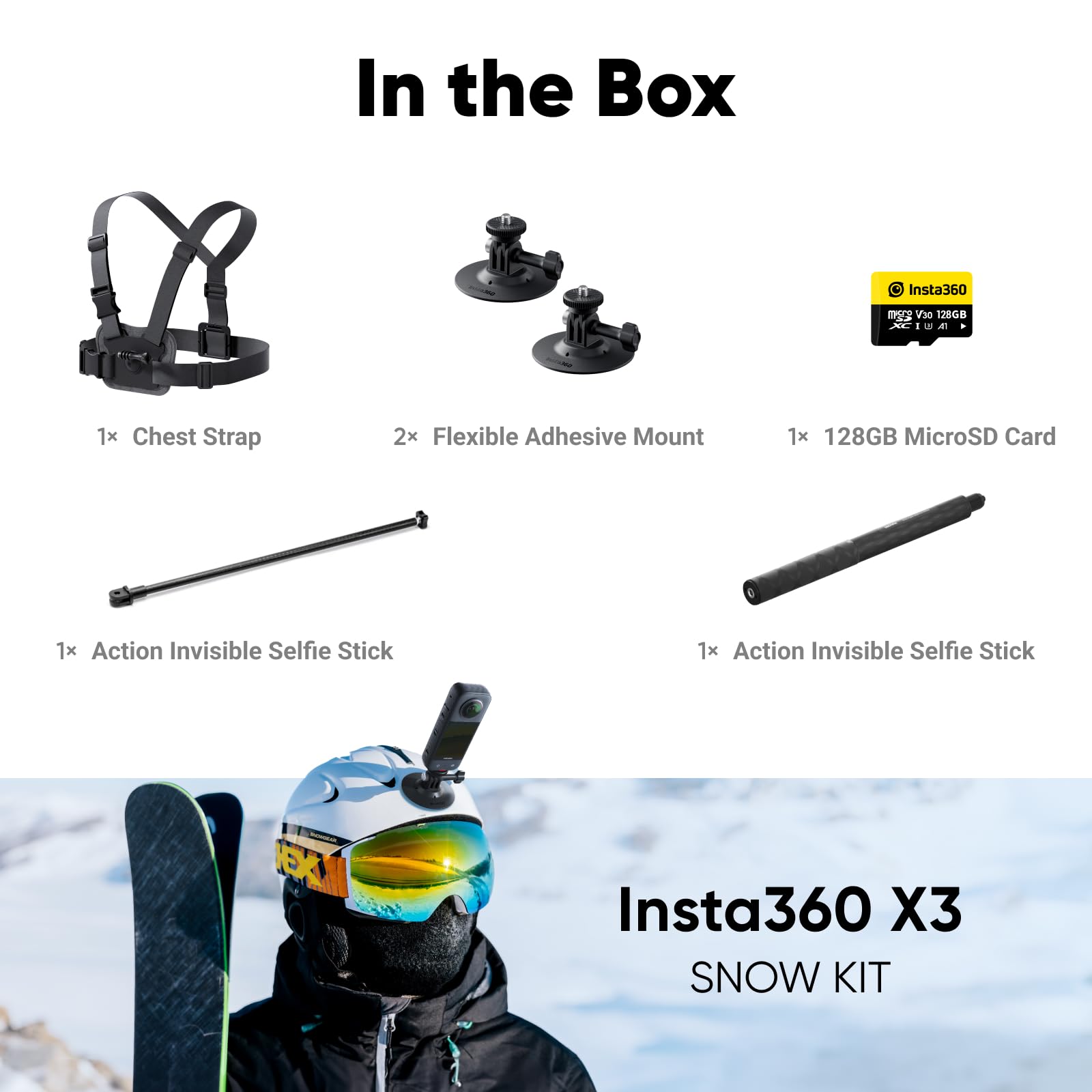 Snow Kit Bundle: Includes Insta360 X3 camera, Action Invisible Selfie Stick, 128GB microSD Card, Snow Bundle, and Lens Cap for all-weather adventures.