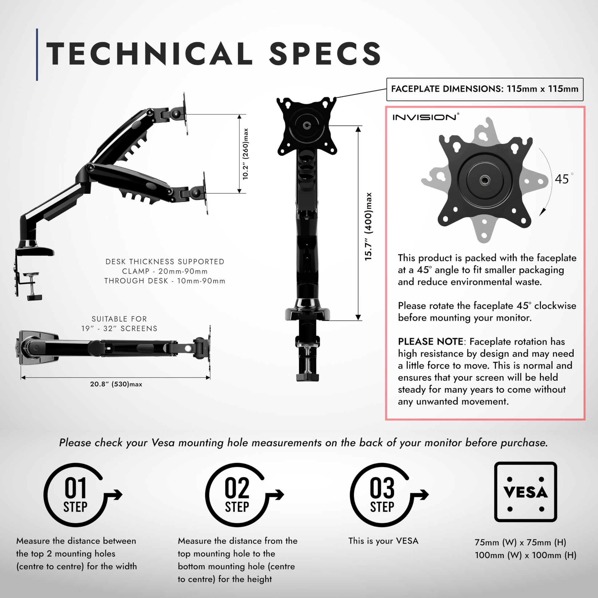 - Invision Single Monitor Arm Desk Mount for 19 to 32 Inch Screens | VESA 75 & 100mm Stand Clamp -