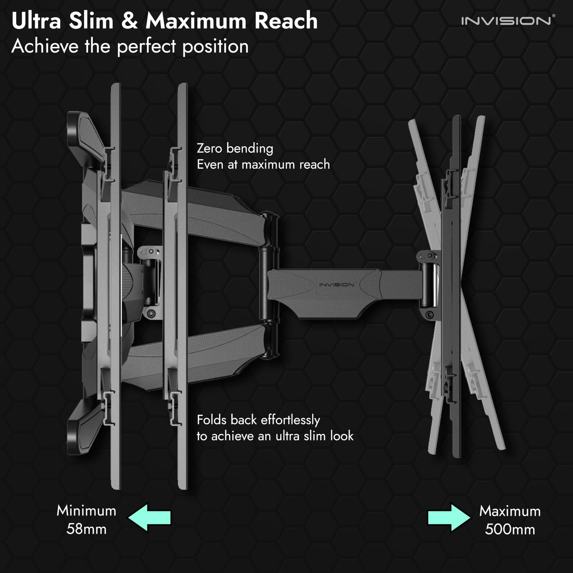Slim Design with Long Reach – The mount’s slim design positions your TV just 58mm from the wall, and with the ability to extend up to 500mm, it provides flexible viewing options without sacrificing style or space.