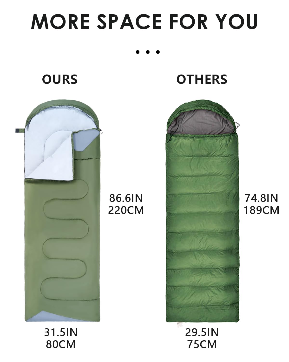 Plenty of Room: Accommodates campers up to 190 cm tall, with a generous size of 220x80 cm, making it larger than most other sleeping bags.