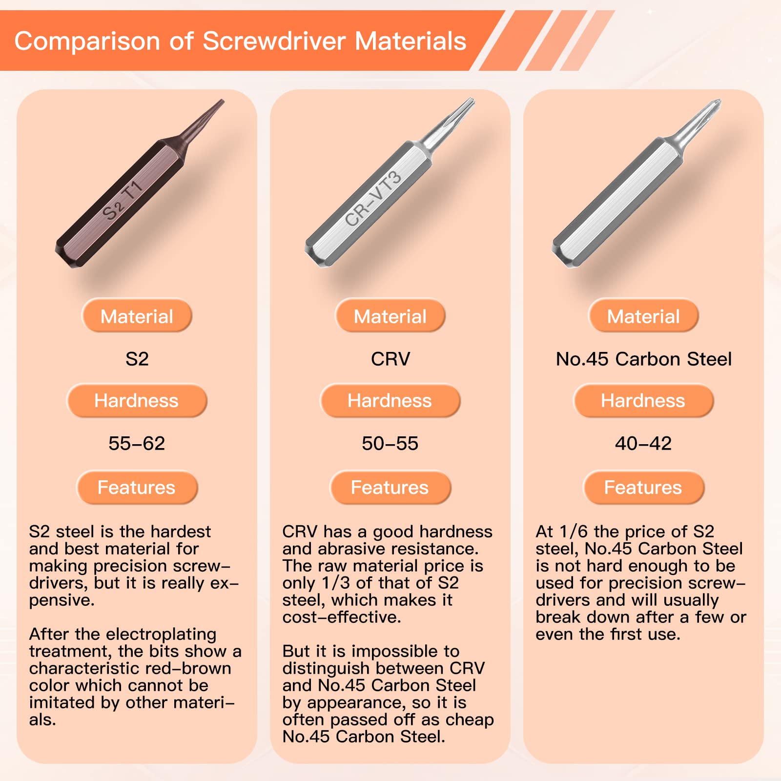 Locking Design & S2 Steel: The screwdriver handle features a locking design to securely hold the screwdriver bits, improving efficiency and stability. Made from high-quality S2 steel, the bits are more accurate and durable than standard CRV bits. The magnetic design of both the handle and bits keeps screws in place, preventing them from falling during repairs.