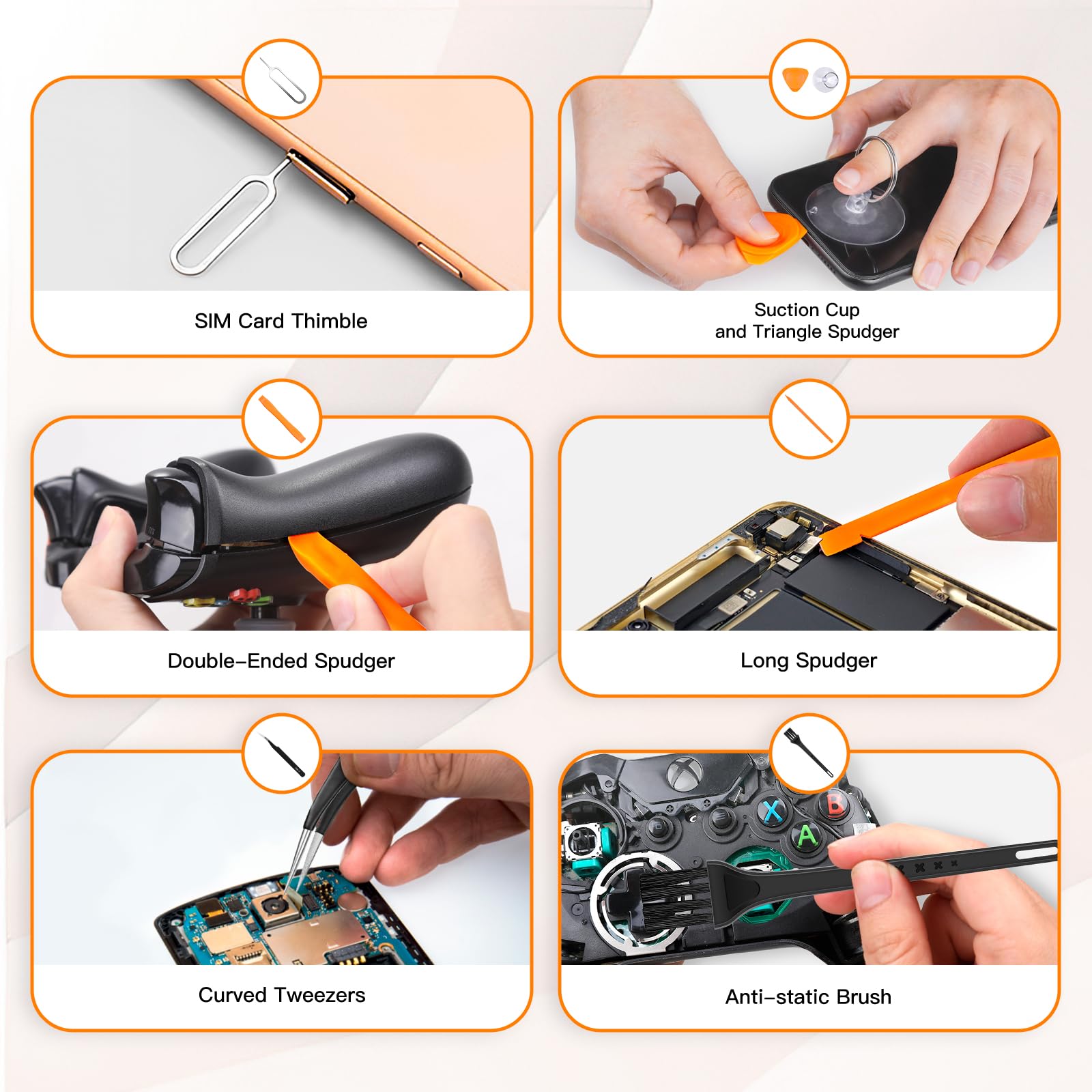 Portable Gadgets: The set includes a variety of accessories for easy disassembly: a triangular spudger for mobile phone screens, a double-ended spudger for game devices, a long spudger for prying internal parts, a suction cup for screen opening, a SIM card thimble, cleaning brush, and tweezers for handling small parts.