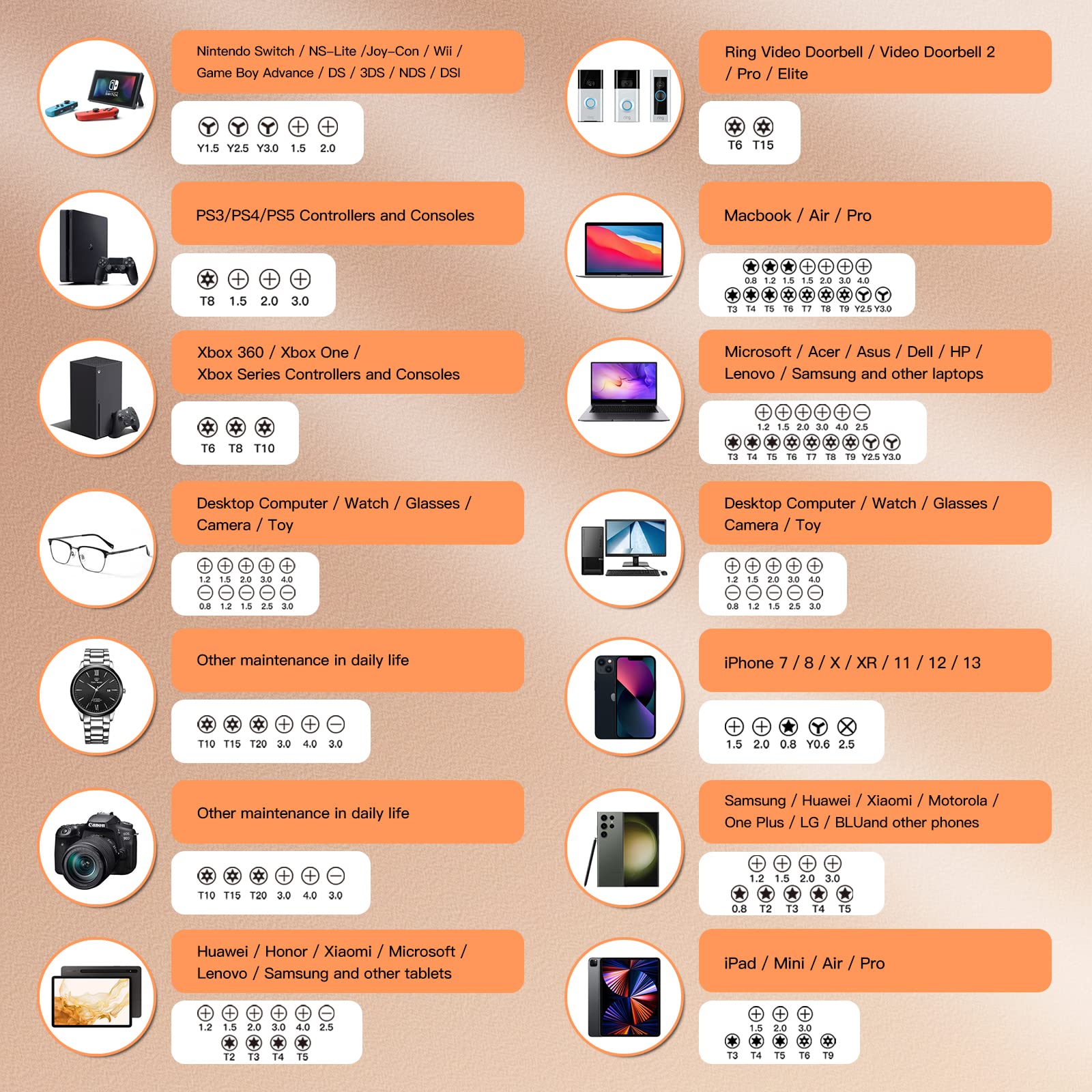 Wide Scope of Application: Perfect for use on a wide range of devices, including iPhone (7/8/X/XR/11/12/13), Samsung, Huawei, Xiaomi, iPad, tablets, laptops (Macbook, Dell, Microsoft, Acer), gaming consoles (PS3, PS4, PS5, Xbox), and more. Includes sizes for repairing smartwatches, toys, and glasses too.