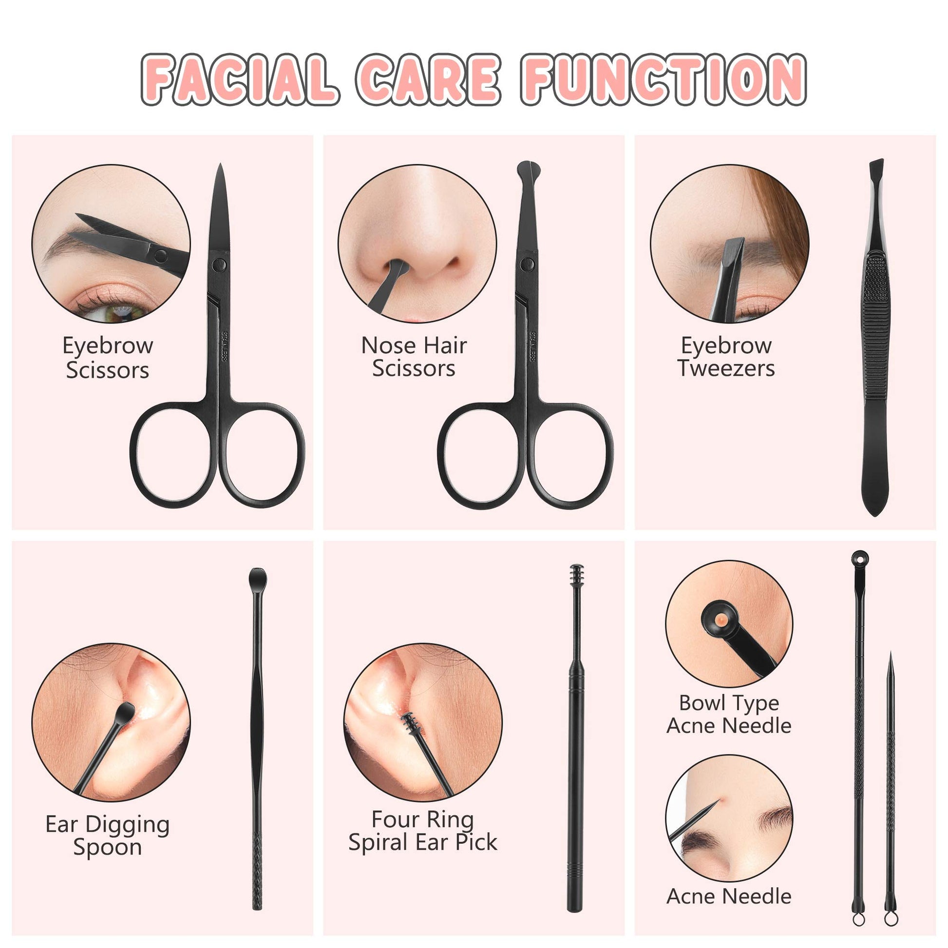 - 19-in-1 Multi-Functional Grooming Kit: Includes tools for manicuring, pedicuring, eyebrow shaping, acne care, exfoliating, and more, making it a comprehensive solution for all grooming needs.