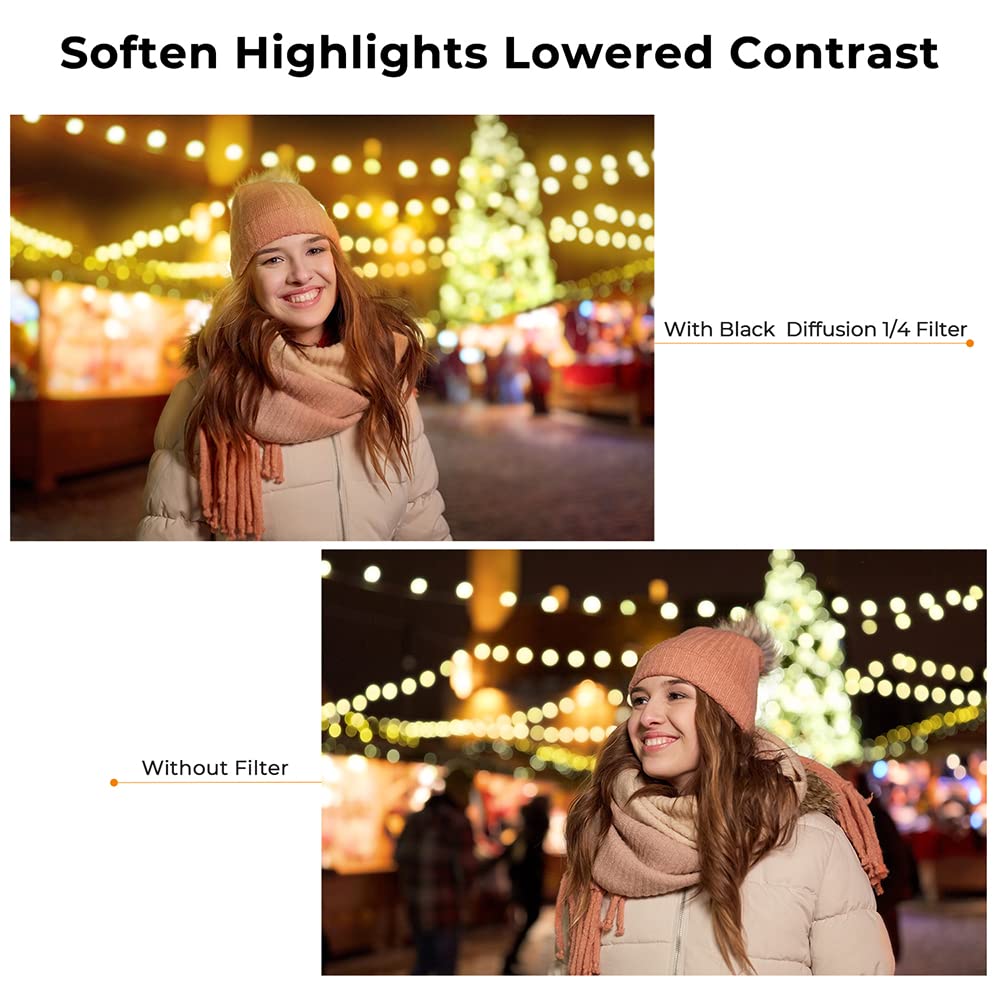 Filter Effect: Softens highlights, such as facial wrinkles and freckles, for more delicate and gorgeous portraits with a dreamlike effect. Ideal for video shooting and portrait photography.
