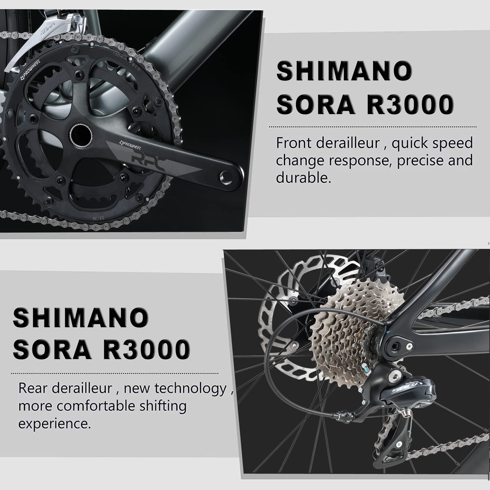 Shimano SORA R3000 Precision Shifting: Equipped with a 2*9-speed Shimano SORA shifter lever, front derailleur, and rear derailleur, this bike offers smooth and reliable shifting for seamless gear transitions during rides.