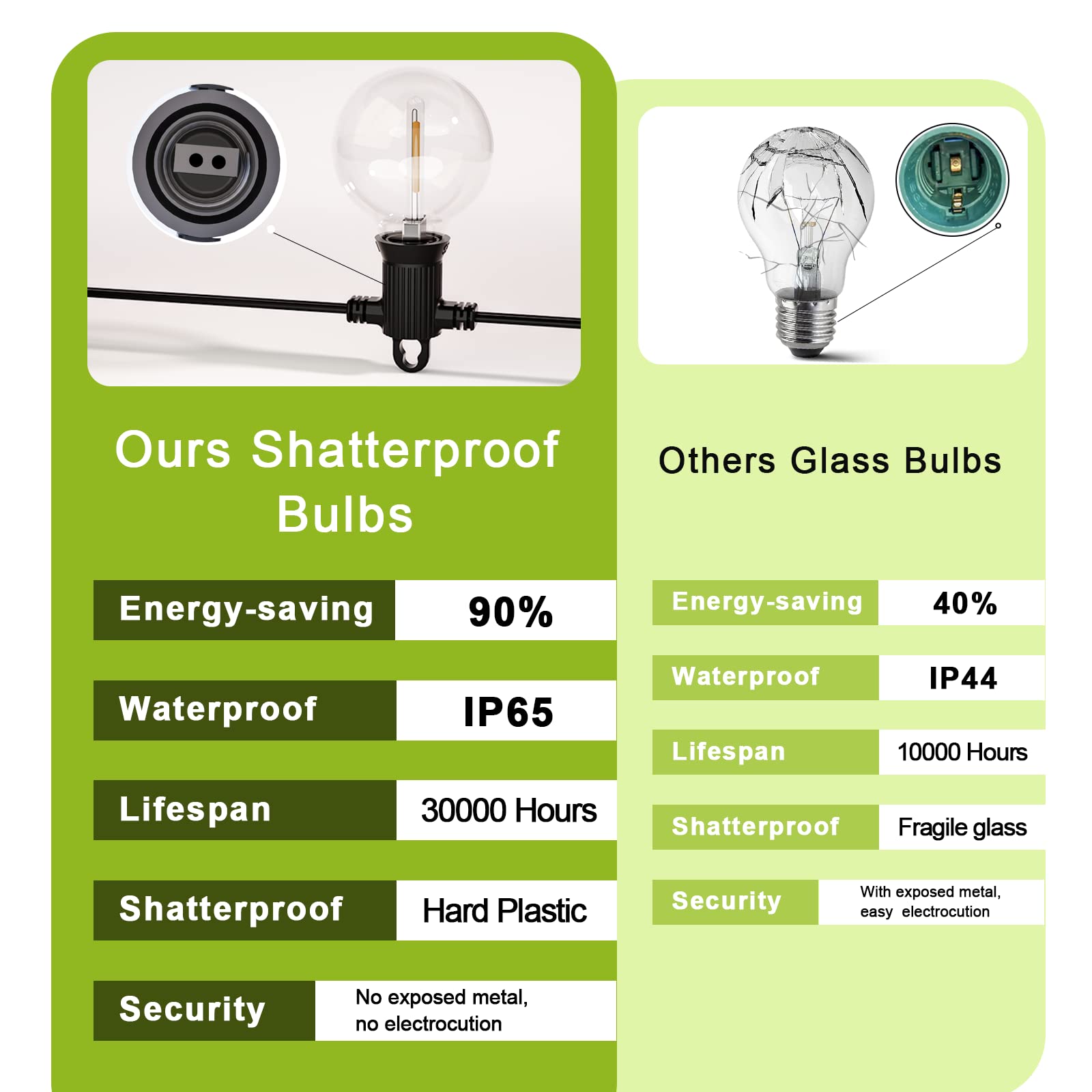 IP65 Waterproof & Shatterproof: The plastic LED bulbs are shatterproof, ensuring they won’t break even if dropped. The IP65 waterproof rating makes these lights perfect for all weather conditions.