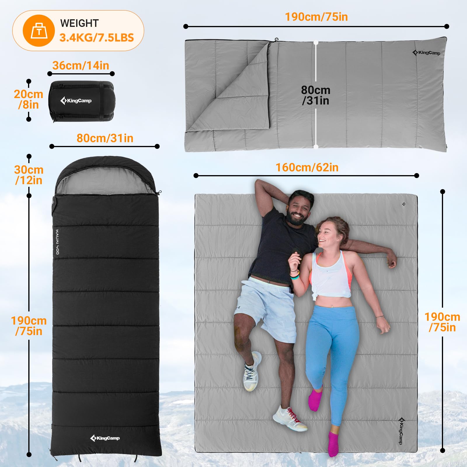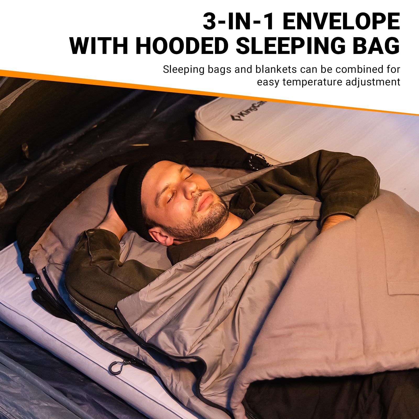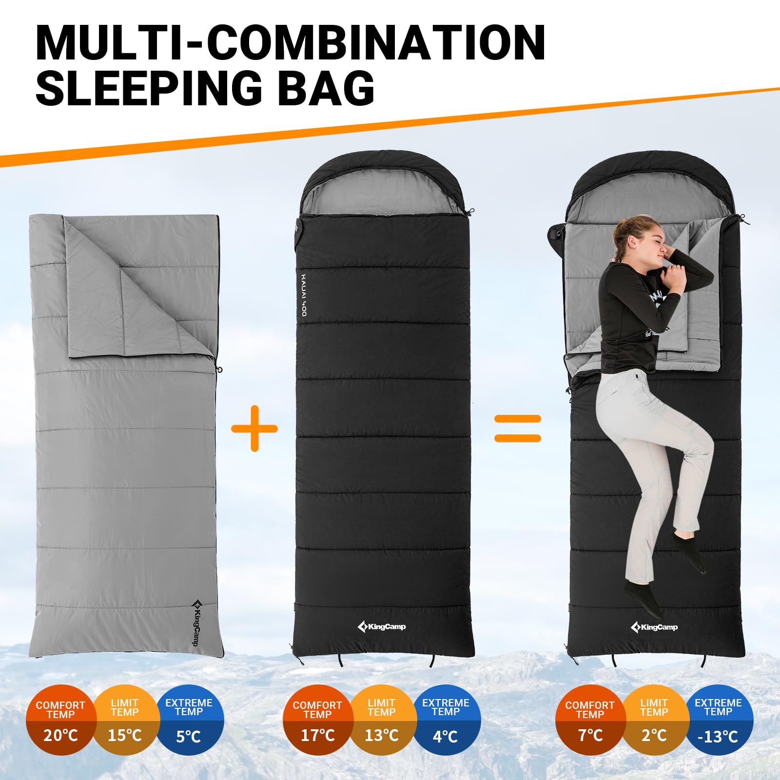Stay comfortable and warm during any outdoor adventure with the KingCamp 4-Season XL Sleeping Bag. Designed for versatility, it features a removable inner layer, transforming it into two separate sleeping bags. Whether you're hiking, camping, or traveling, this sleeping bag is ready for all seasons.