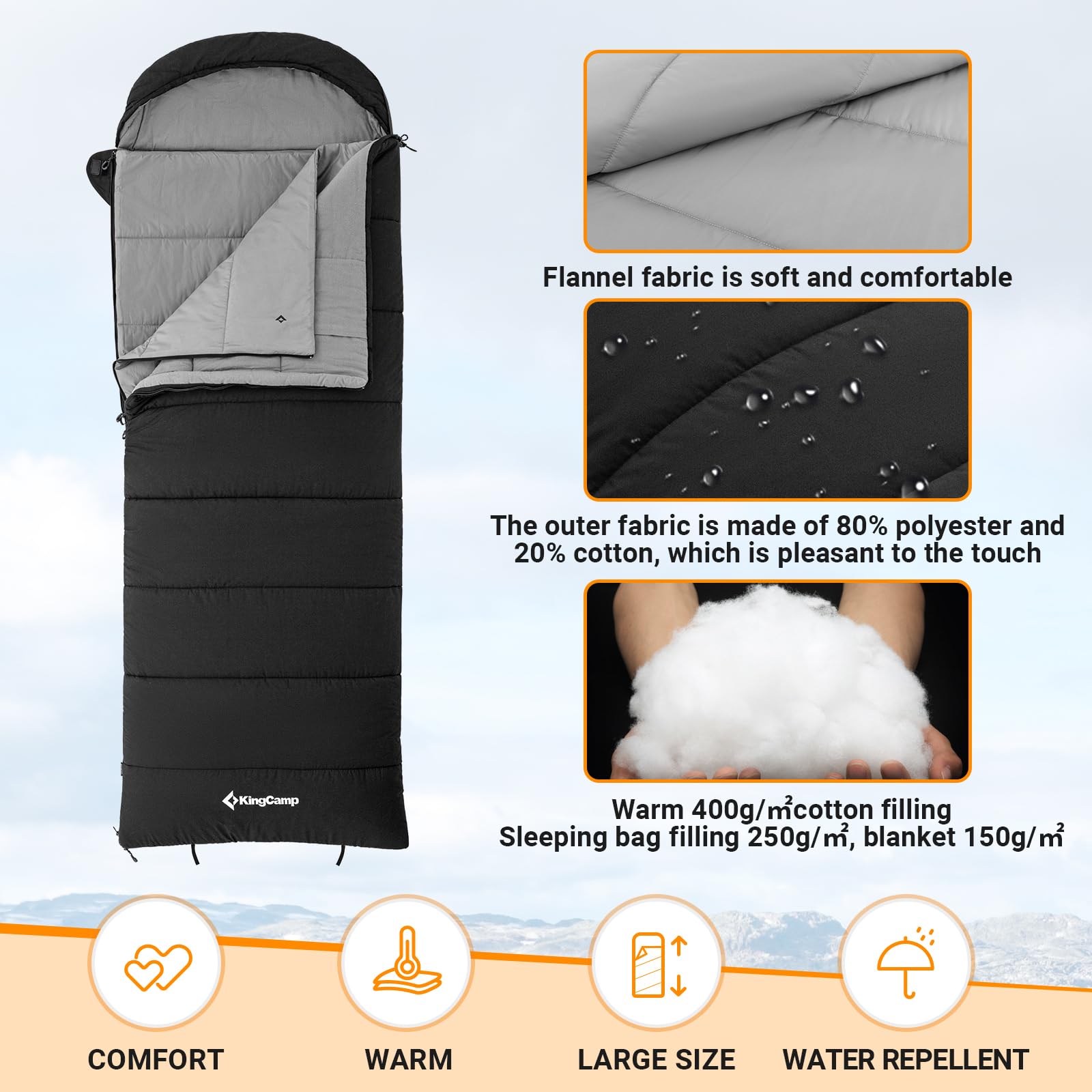 - KingCamp 4 Season Flannel Sleeping Bag For Adults | Warm & Cool Weather XL Wide -
