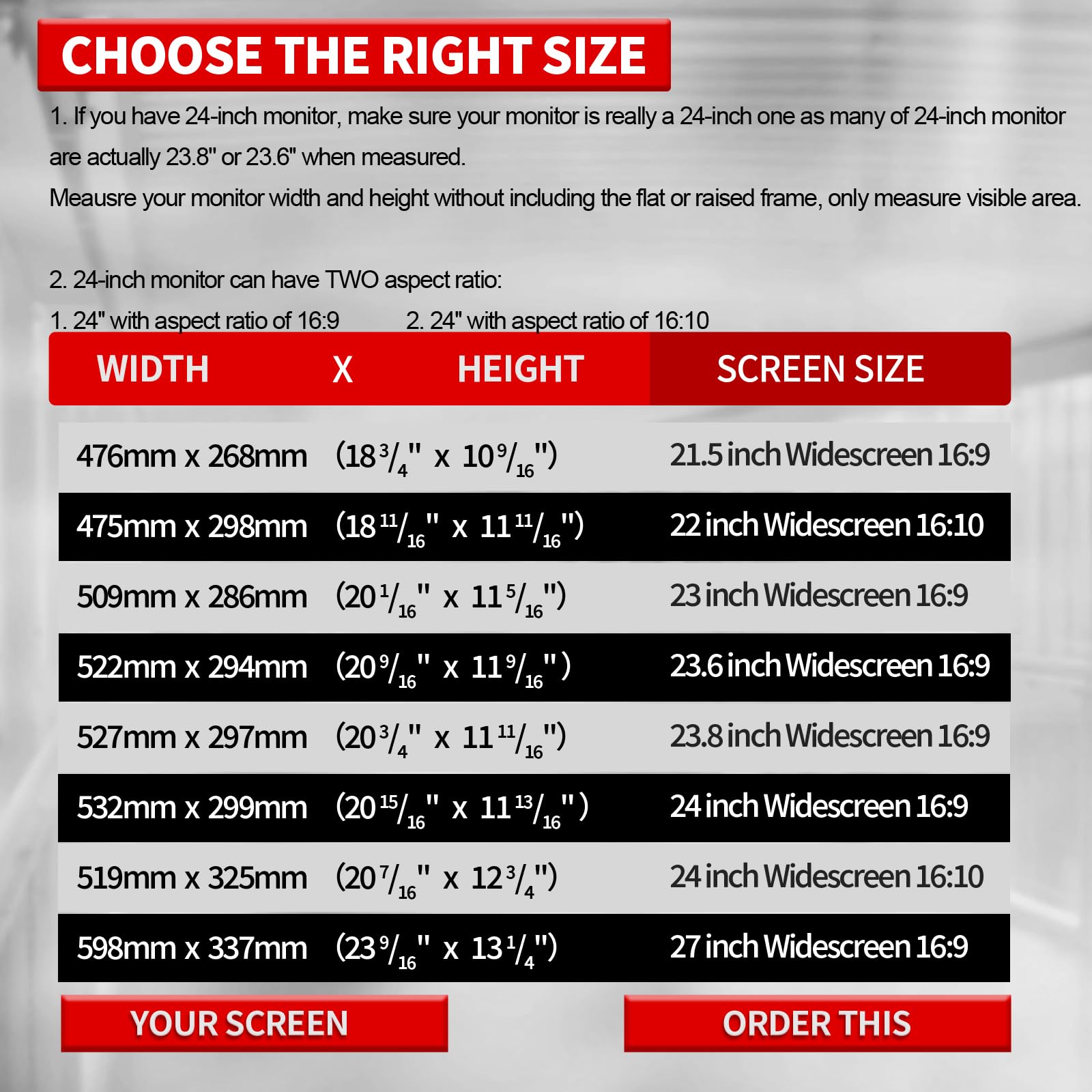 - Screen Size Compatibility: 21.5 inches (check Width & Height before ordering)