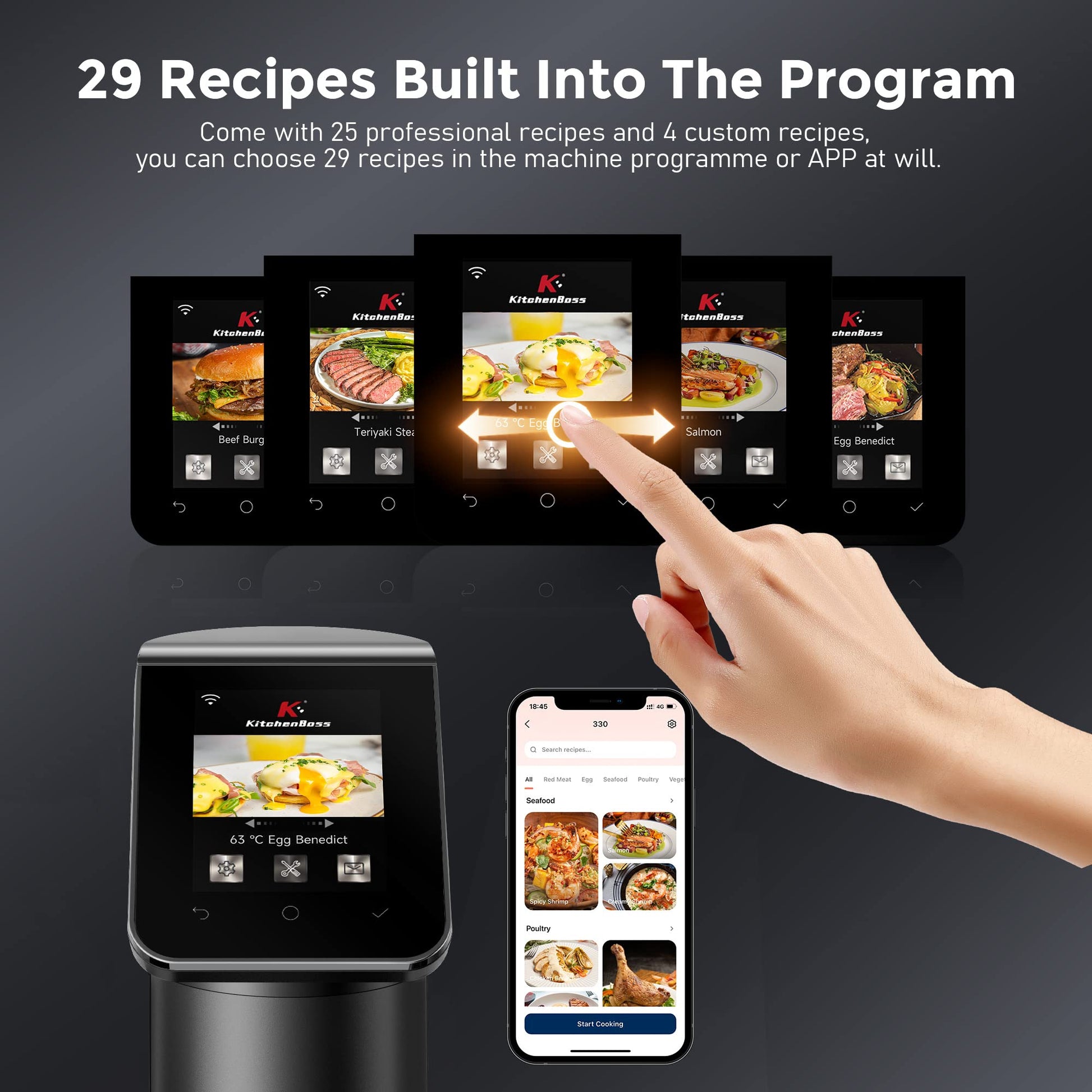 - KitchenBoss Sous Vide Machine WIFI Precision Cooker | 1100 Watts App Temperature Control 40°C-90°C | IPX7 Immersion Circulator -