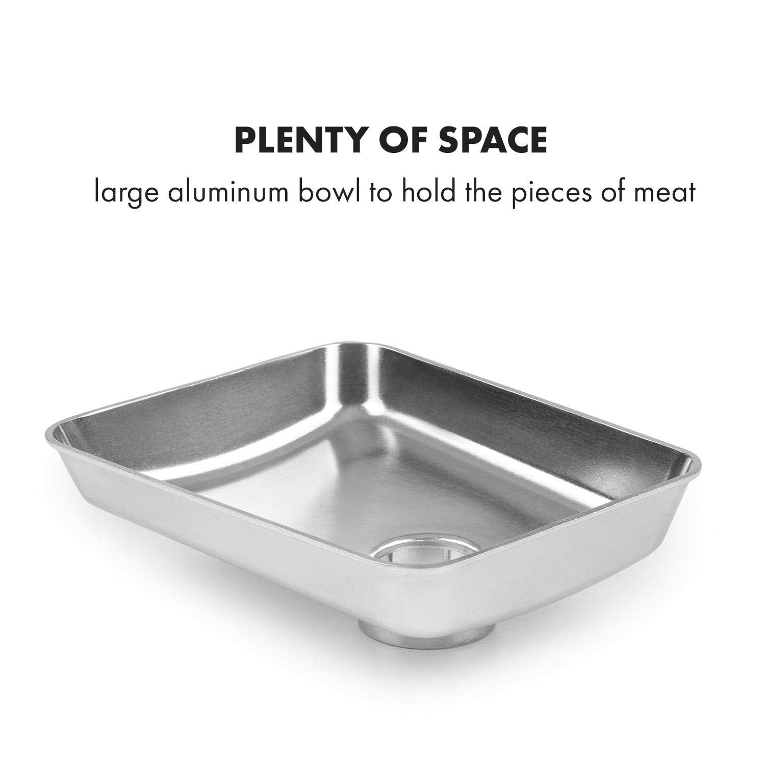 - Easy to Use & Clean – Large aluminum tray holds generous portions of meat, while rounded edges inside the grinder make cleaning simple.