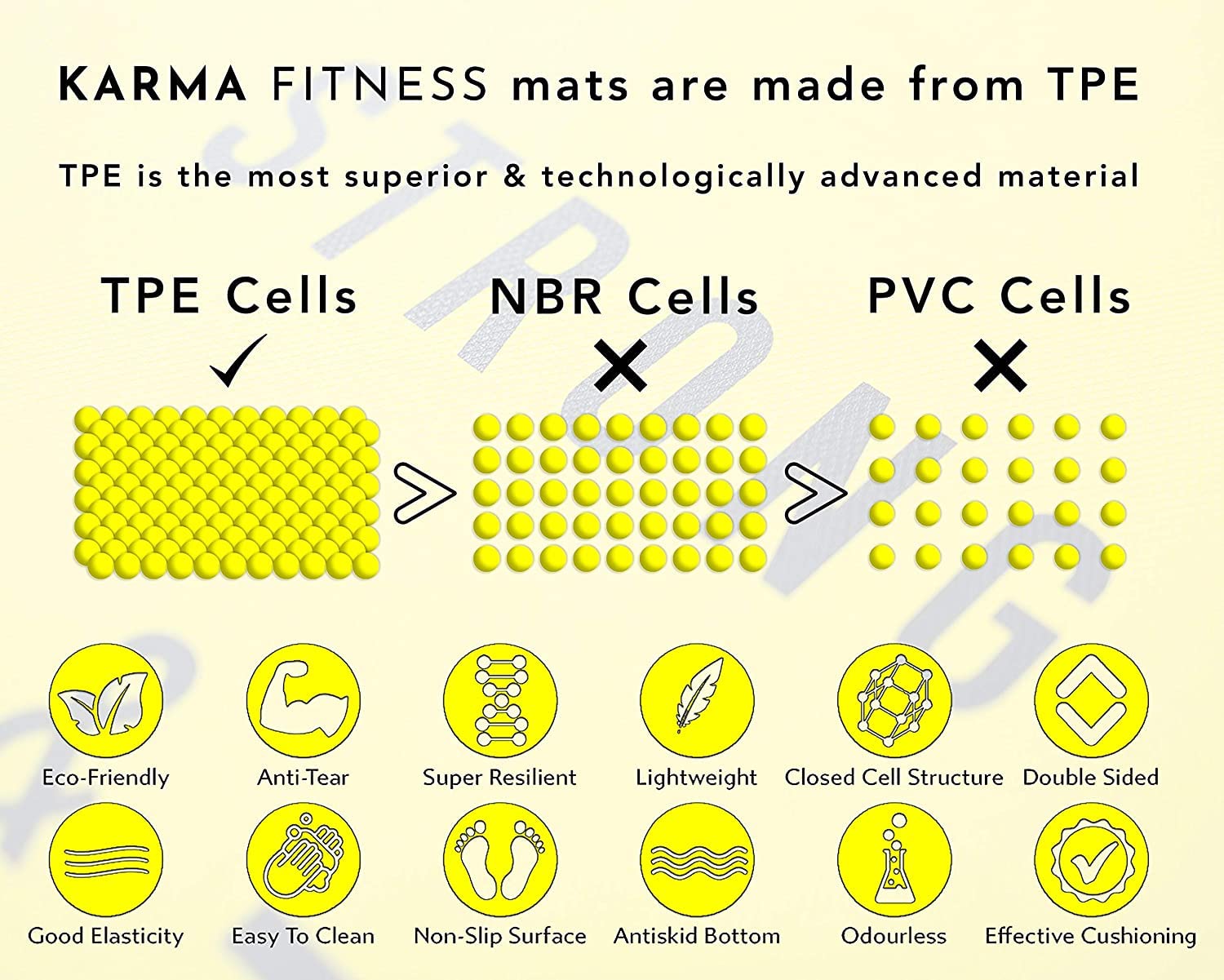 - Double Layered TPE Material: Made with custom double-layered TPE, this mat offers superior durability, support, and stability. TPE is a denser, waterproof material that is sweat-resistant, easy to clean, and 100% recyclable.