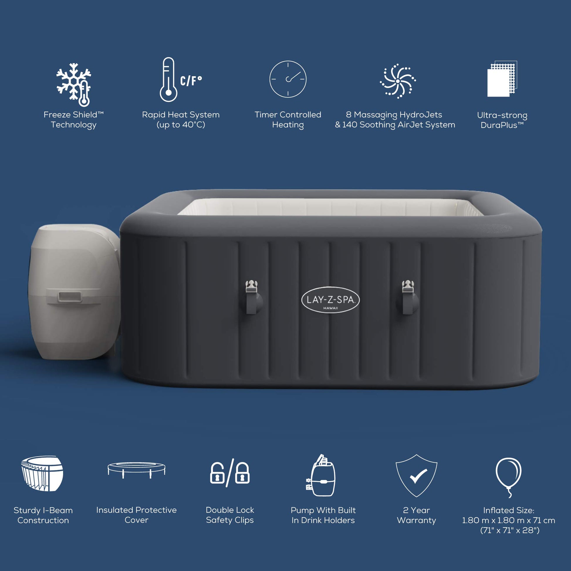 - Lay-Z-Spa Hawaii Hot Tub | 8 HydroJet Pro Massage System | Inflatable Spa | Freeze Shield Technology | Sociable Square Shape | 4-6 Person -